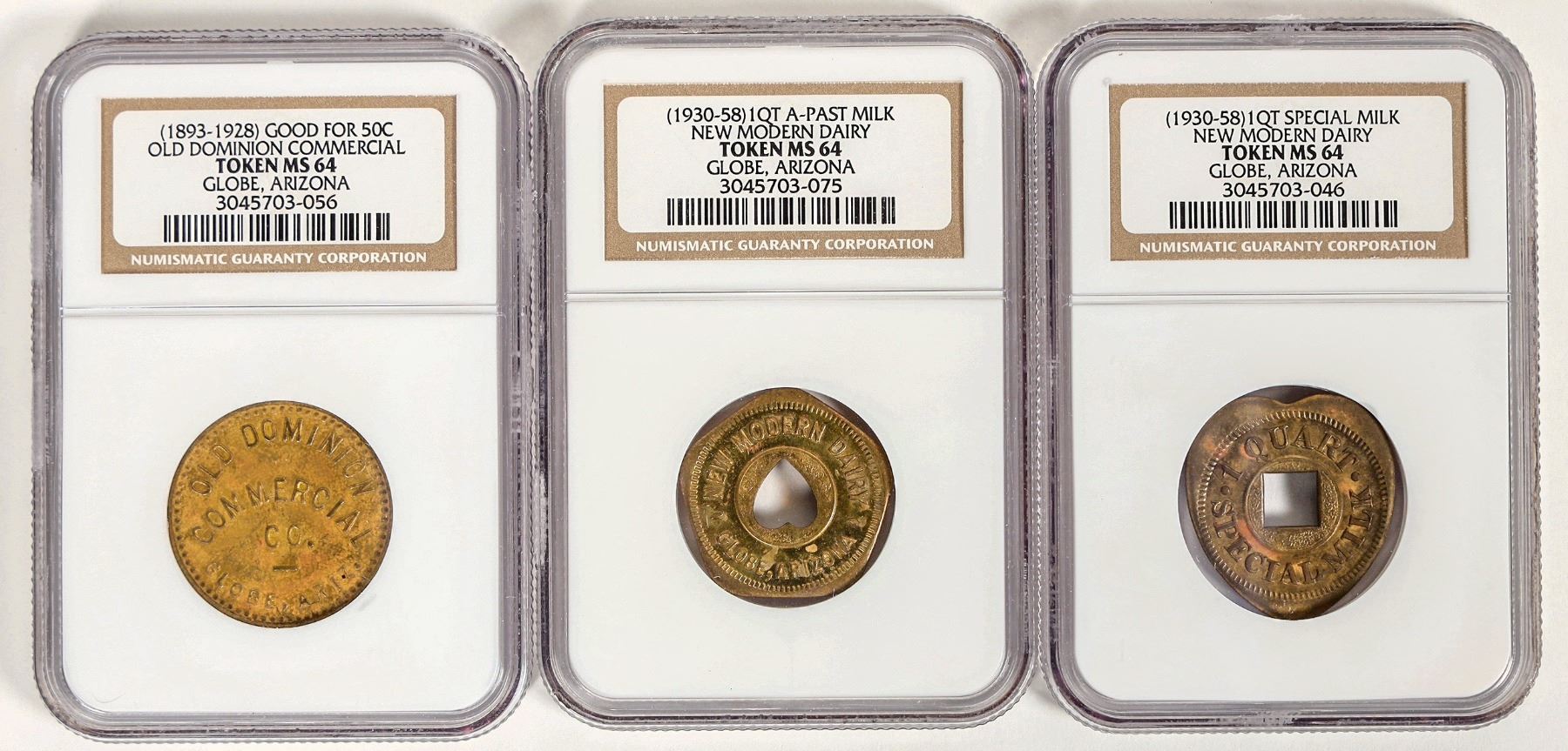 Three Gila County tokens graded MS 64 by NGC: 1) OLD DOMINION / COMMERCIAL / CO. / GLOBE, ARIZ. // GOOD FOR / 50¢ / IN TRADE; Br., rd., 28 mm. 2) NEW MODERN DAIRY / GLOBE, ARIZONA // 1 QUART / A-PAST. MILK (heart cutout); Br. pent., 25 mm. 3)