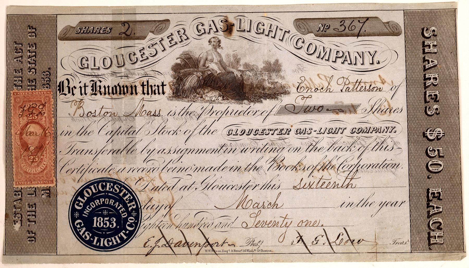 #367, issued for 2 shares in 1871. The company incorporated in 1853. The certificate has a tape repair on the back for a split in the left fold which shows through. Allegorical female. Revenue stamp at left. Black on creme. W.W. Wilson, Engr. Boston. Uncanceled.