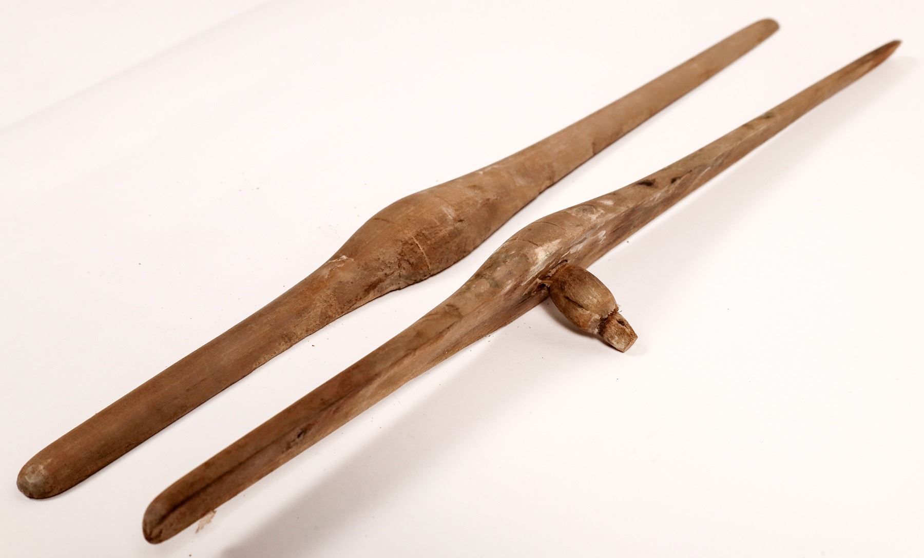 Glove Stretcher from the Easton Trunk. Appears to be wooden, two pieces with a dowel in the middle. Measures approximately 12 inches by 1 inch with 1 inch dowel attached to one side. Flat surface on inside and curved on the outside.