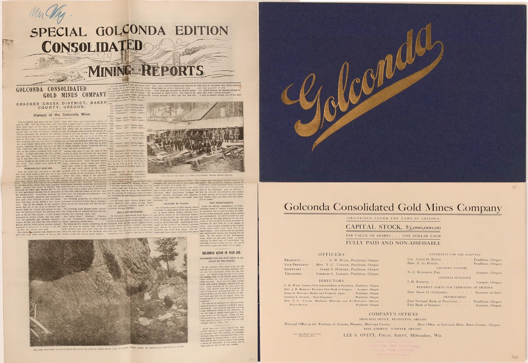1) Golconda Consolidated Gold Mines Company Prospectus. Cracker Creek District,Baker County, Oregon. Consists of 9 Quartz and 13 Placer Claims on 212 Acres. 11" x 8" Embossed booklet with 28 pages, 16 photos.