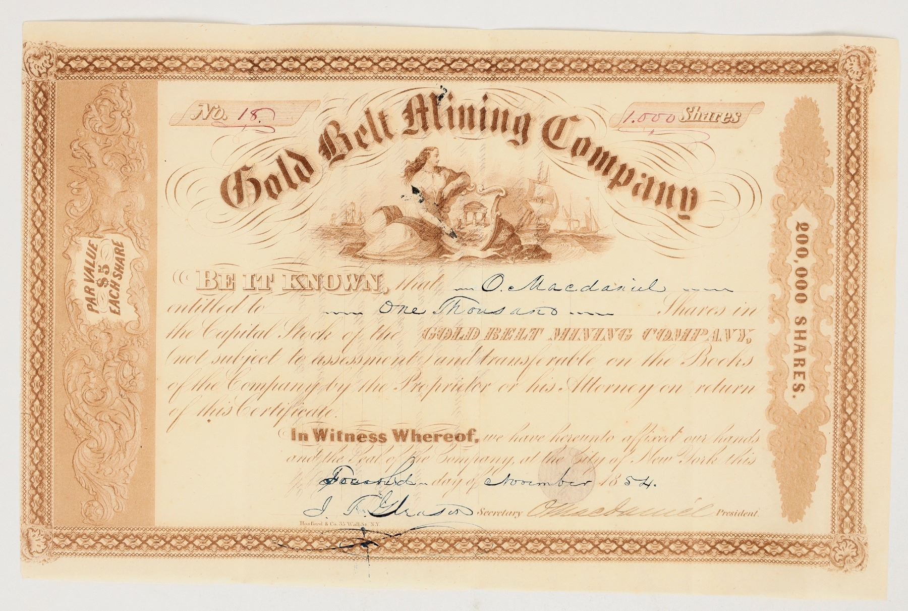 No. 18, issued for 1,000 shares to O. Macdaniel, company president, in 1854 in New York. Signed by Macdaniel and the secretary. Not cancelled. Brown print and allegorical vignette. Folds, 6.5 x 10.5" We believe this company to have operated at Gold Hill, North Carolina. The only mentions we found on newspapers.com were 1855 mentions of a Trust Sale of furniture from the company at Gold Hill, NC. We also found a March 1854 article that mentioned Macdaniel was the vice president of the newly formed Aberdeen Company that would work the tailings at Gold Hill. It seems likely the Gold Belt MC was a spinoff venture.