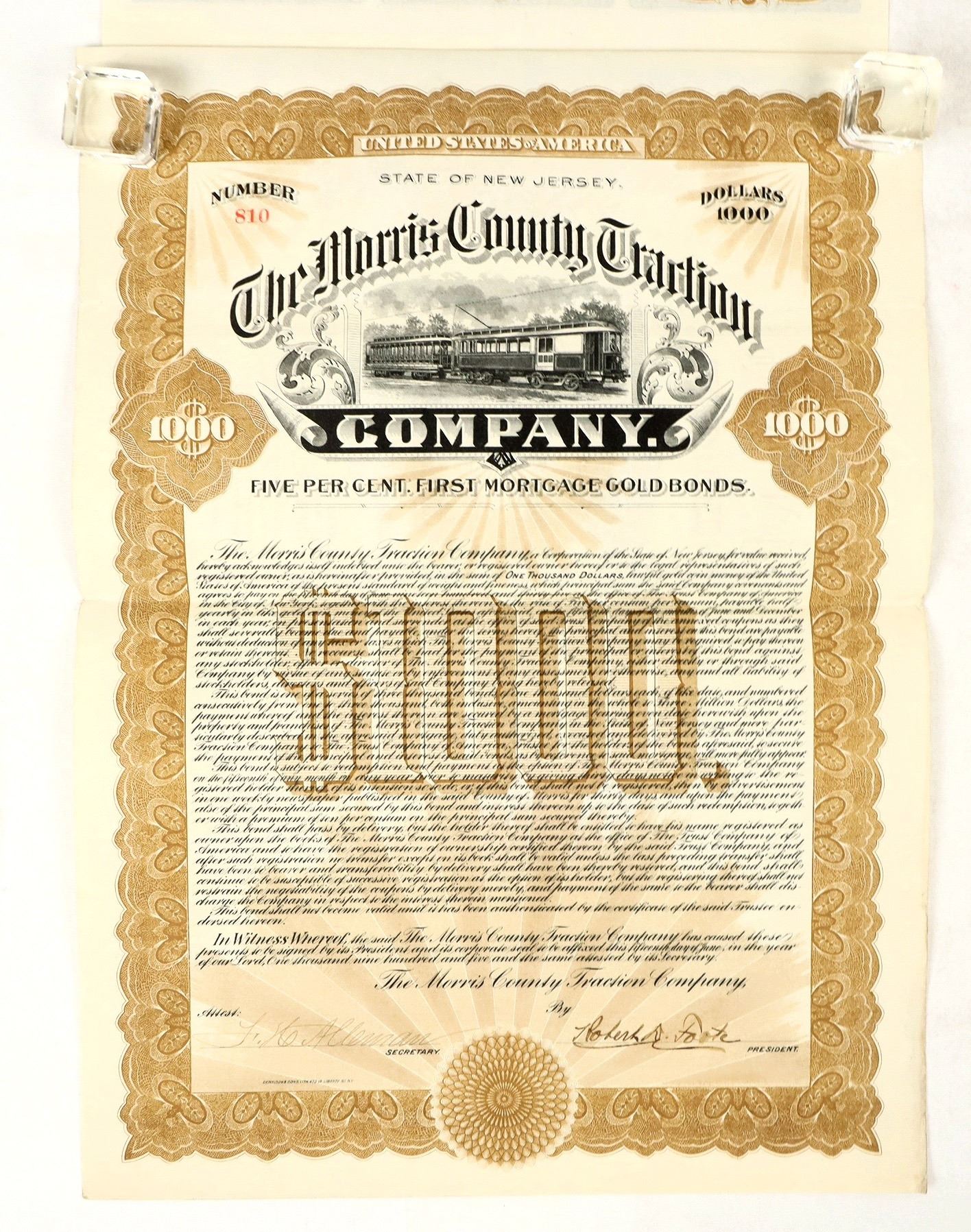 Gold bond certificate ($1000, 5%) from the Morris County Traction Company of New Jersey, dated 1905. Issued with signatures of secretary and president, uncancelled. Attached page of bond coupons missing 4 coupons. Nice vignette of passenger rail. Good condition; see photos.