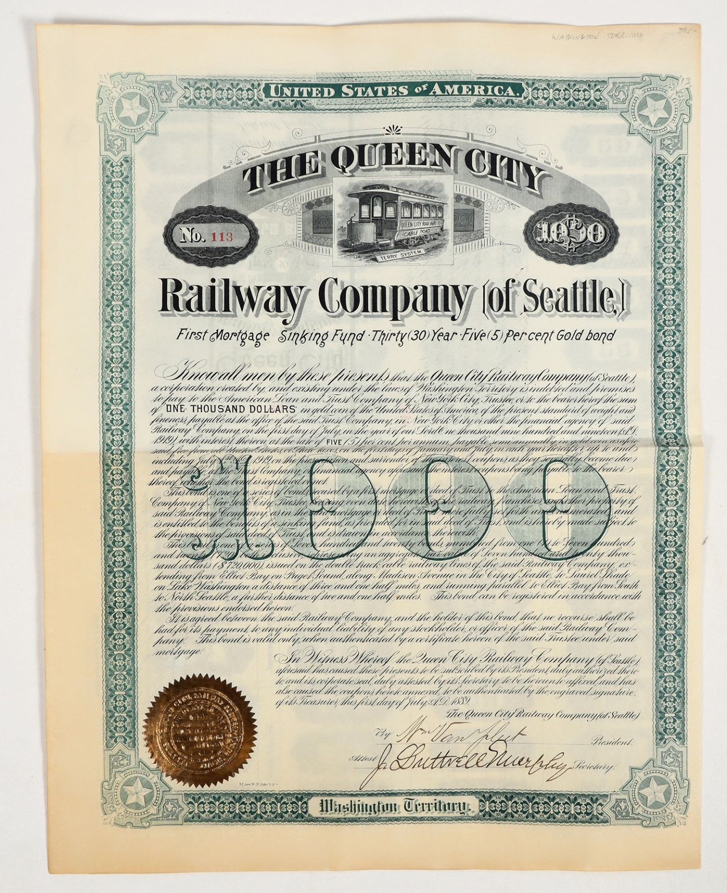 Gold bond certificate for $1000 from the Queen City Railway Company of Seattle. Issued 1899 with signatures of president and secretary + gilt and embossed company seal, uncancelled. Includes fully intact page of bond coupons. Nice vignette of streetcar with the company's name. Good condition; see photos.