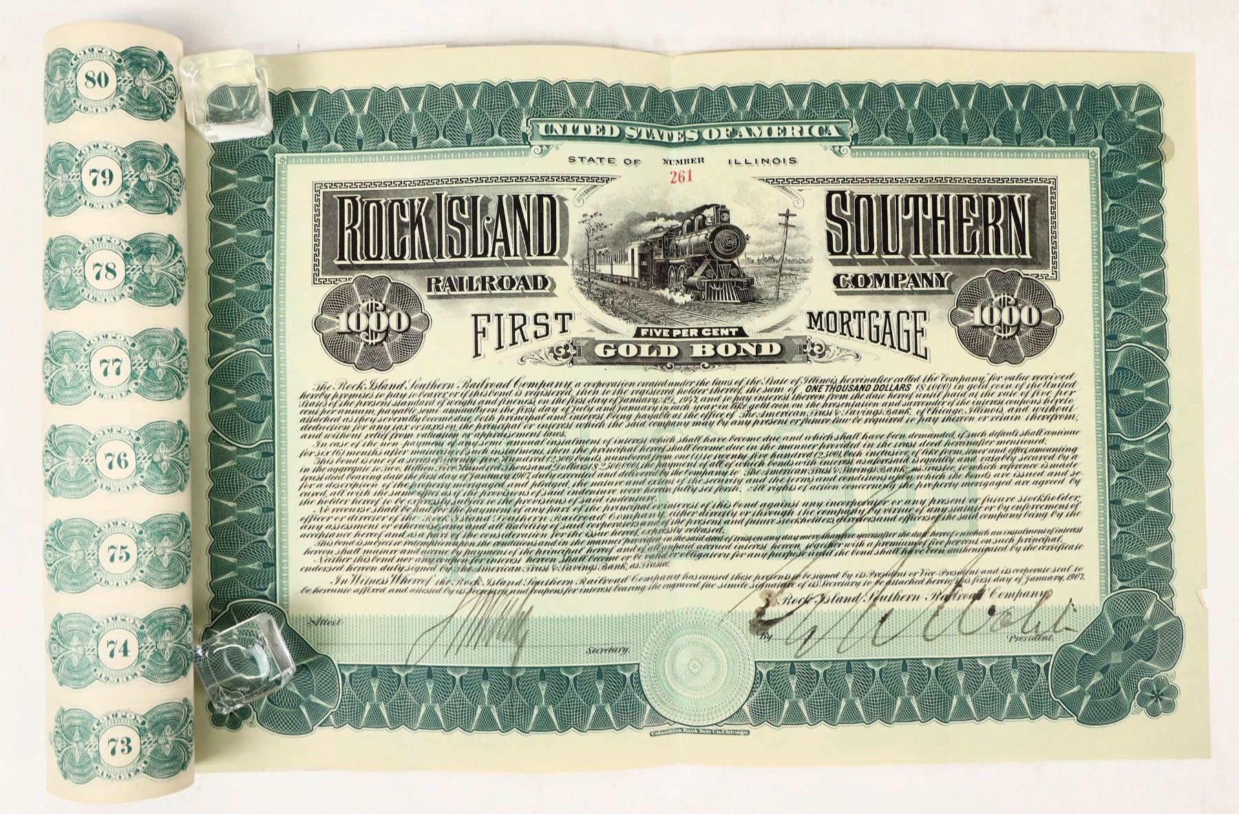 Gold bond certificate ($1000, 5%) from the Rock Island Southern Railroad Company, dated 1907. Issued w/ signatures of president and secretary, uncancelled. Two pages of bond coupons attached, one fully intact, one missing 23 coupons. Nice locomotive vignette. Good condition; see photos.