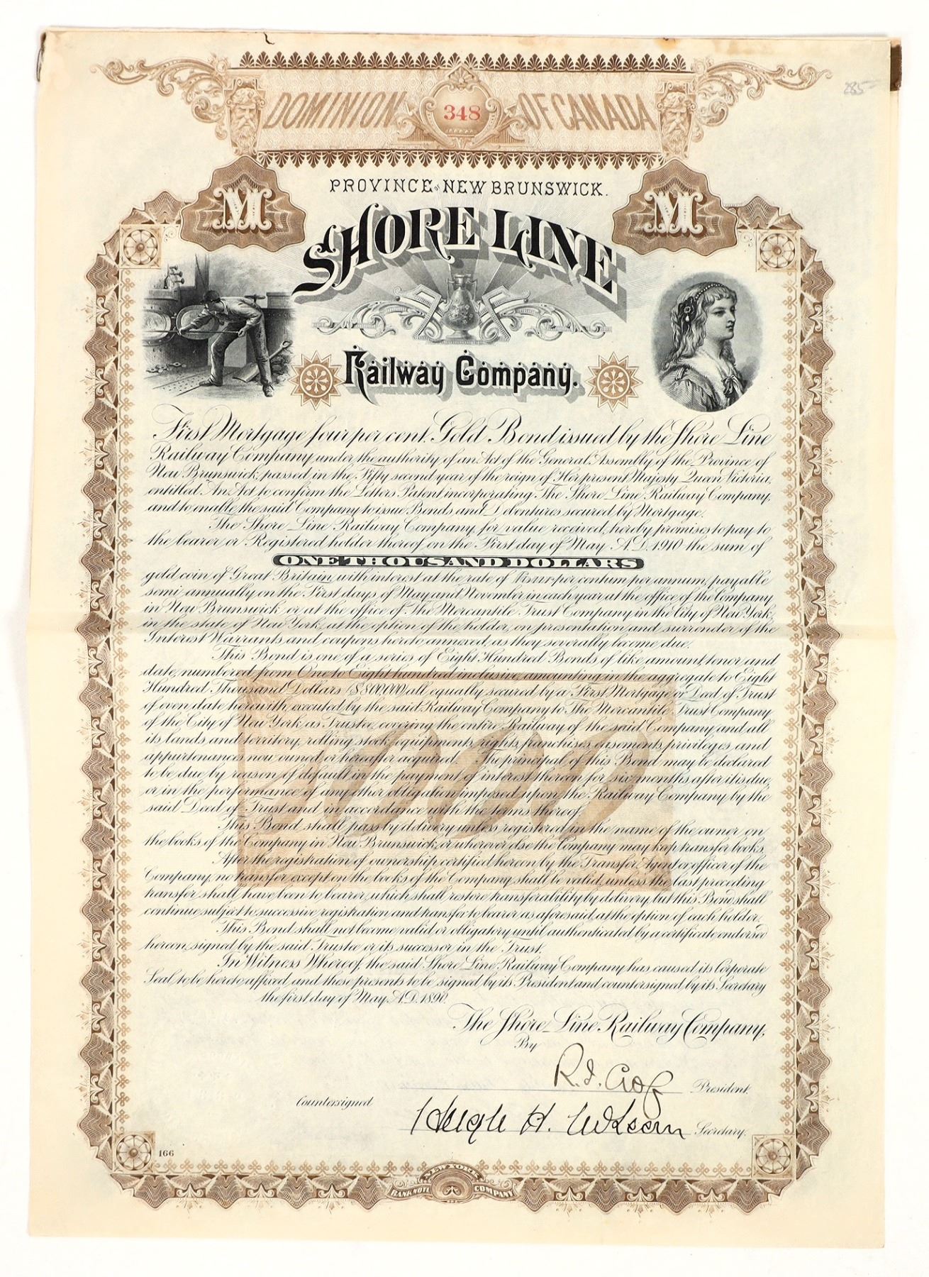 Gold bond certificate from the Shore Line Railway Company of New Brunswick, Canada. Issued 1890 with signatures of president and secretary + embossed company seal. Nice vignettes. Partially intact page of bond coupons attached. Fine condition w/ some discoloration; see photos.