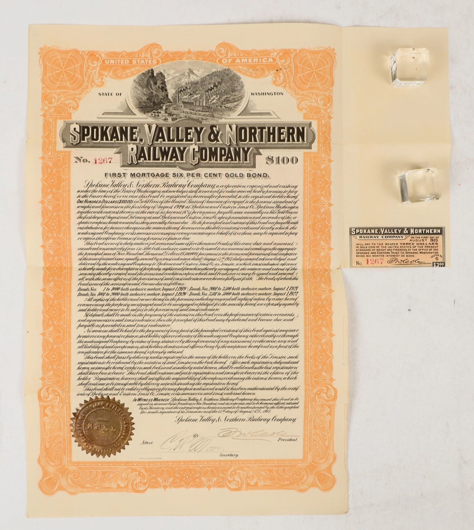 Gold bond certificate ($100, 6%) from the Spokane, Valley & Northern Railway Company, dated 1917. Issued with signatures of president and secretary + embossed seal, uncancelled. One attached bond coupon. Nice landscape vignette. Good condition, some edge wear; see photos.