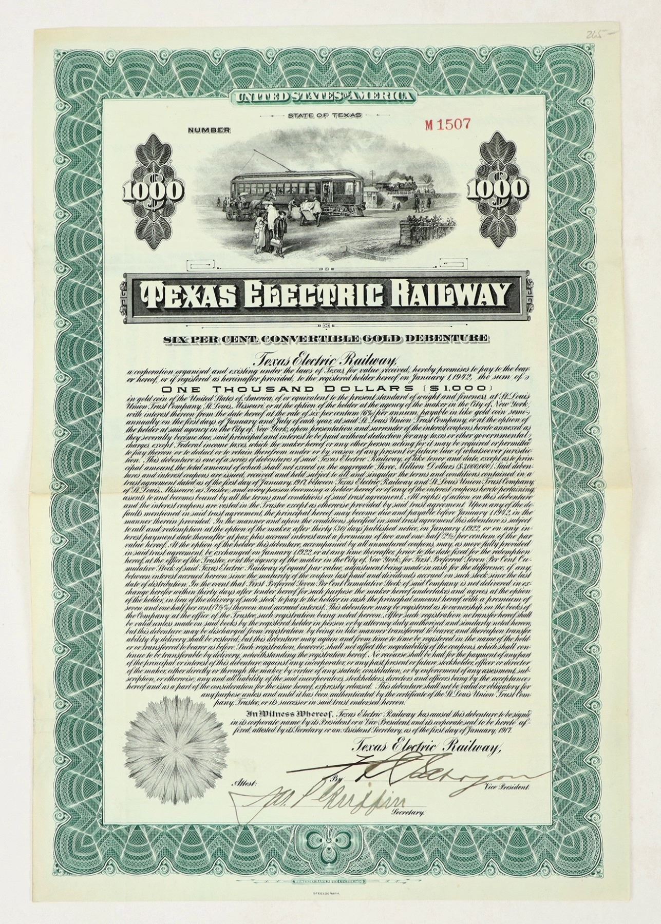 Gold debenture certificate ($1000) from the Texas Electric Railway, dated 1917. Issued with signatures of secretary and VP, uncancelled. Nice vignette of travelers and streetcar. Good condition, some toning; see photo for details.