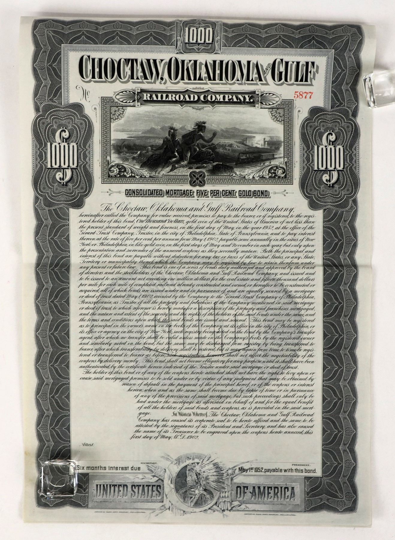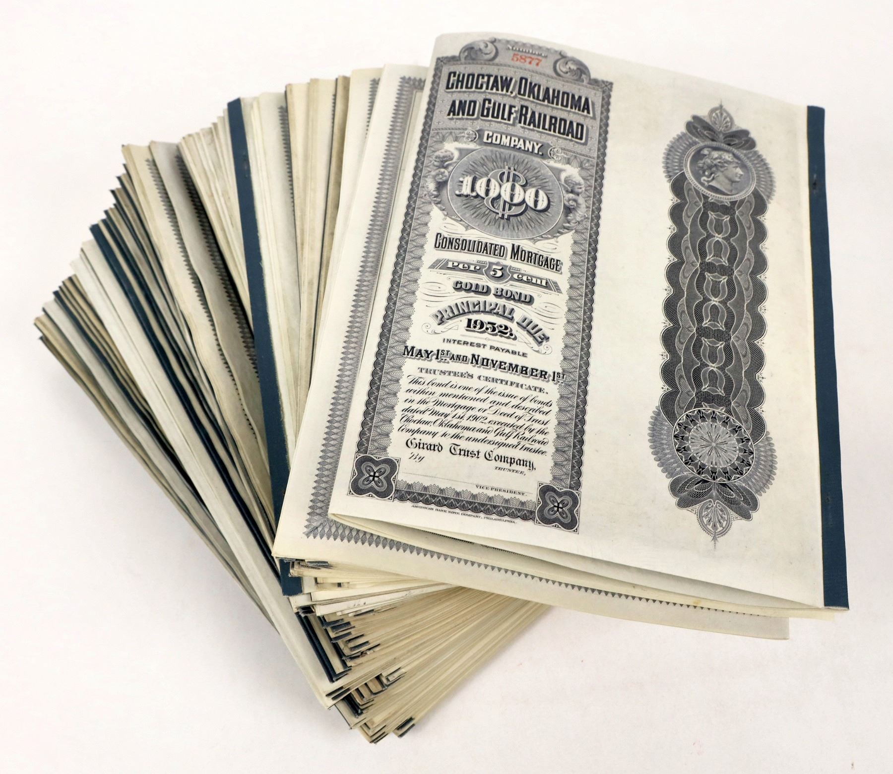 Group of approx. 75 unissued gold bond certificates from the Choctaw, Oklahoma and Gulf Railroad Company, all dated 1902 with principal due 1952. All uncancelled with fully intact sheet of bond coupons. Beautiful certificate design with great vignettes of Native American braves watching a train pass and a Native American man wearing a war bonnet. 14.5"x10" certs, all in excellent condition; see photos.