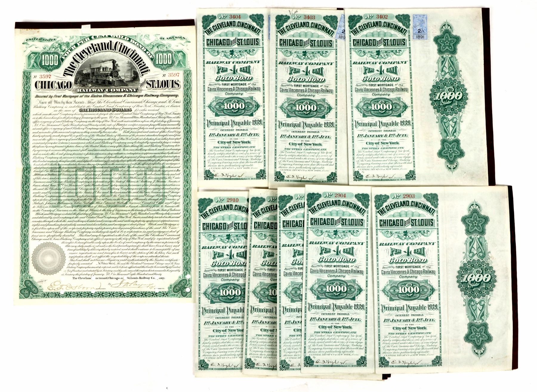 Group of 10 gold bond certificates ($1000, 4%) from the Cleveland, Cincinnati, Chicago and St. Louis Railway Company, all dated 1890. All issued with signatures of secretary and president, all cancelled w/ hole punch through signature line. Nice locomotive vignette. Good condition; see photos.