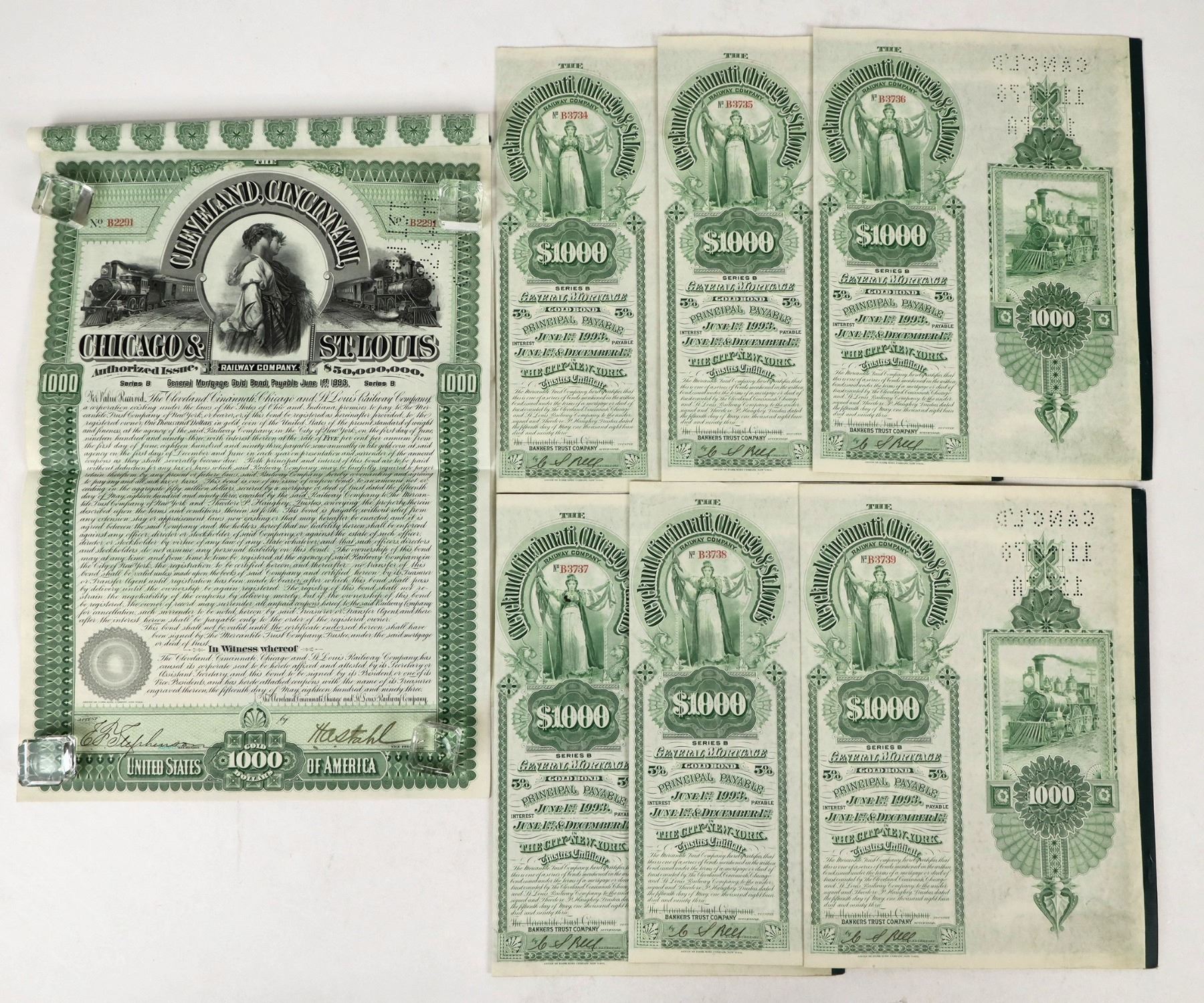 Group of 7 gold bond certificates ($1000, 5%) from the Cleveland, Cincinnati, Chicago and St. Louis Railway Company, all dated 1893. All issued with signatures of asst. secretary and VP, all cancelled w/ hole punched cancellation. Mostly intact page of bond coupons attached to each. Excellent allegorical and locomotive vignettes. Good condition; see photos.