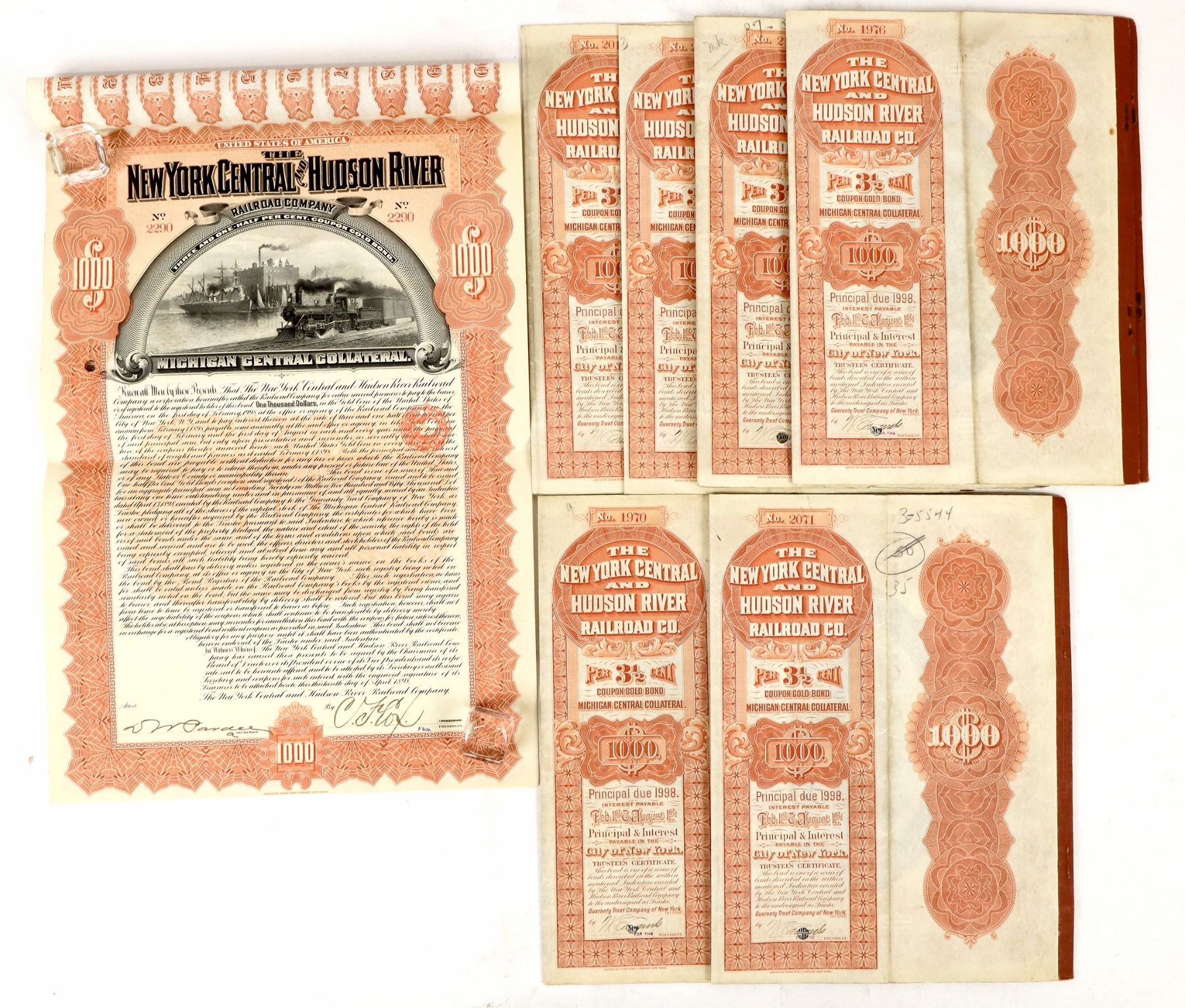 Group of 9 gold bond certificates ($1000, 3.5%) from the New York Central and Hudson River Railroad Company, all dated 1898. All issued with signatures of secretary and VP, all cancelled with holes punched through signature line. Each has an intact page of bond coupons. Great vignette of industrial scene w/ locomotive and ship. Some light toning/soiling; see photos.