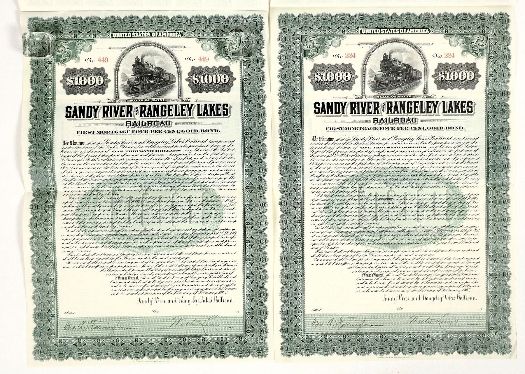 2 gold bond certificates from the Sandy River and Rangeley Lakes Railroad of Phillips, Maine. Both issued 1908 with signatures of president and secretary + embossed company seal, uncancelled. Partially intact page of bond coupons on each. Nice locomotive vignette, good condition; see photos.
