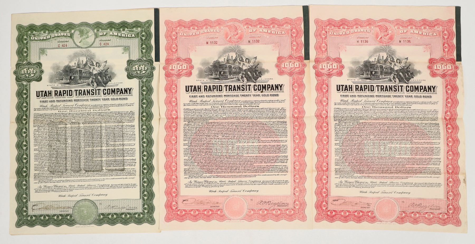 Group of 3 gold bond certificates from the Utah Rapid Transit Company, issued 1920. All certificates issued and uncancelled. Lot includes 1 green and 2 red certs; one missing bond coupon on green. Generally good condition, see photos.