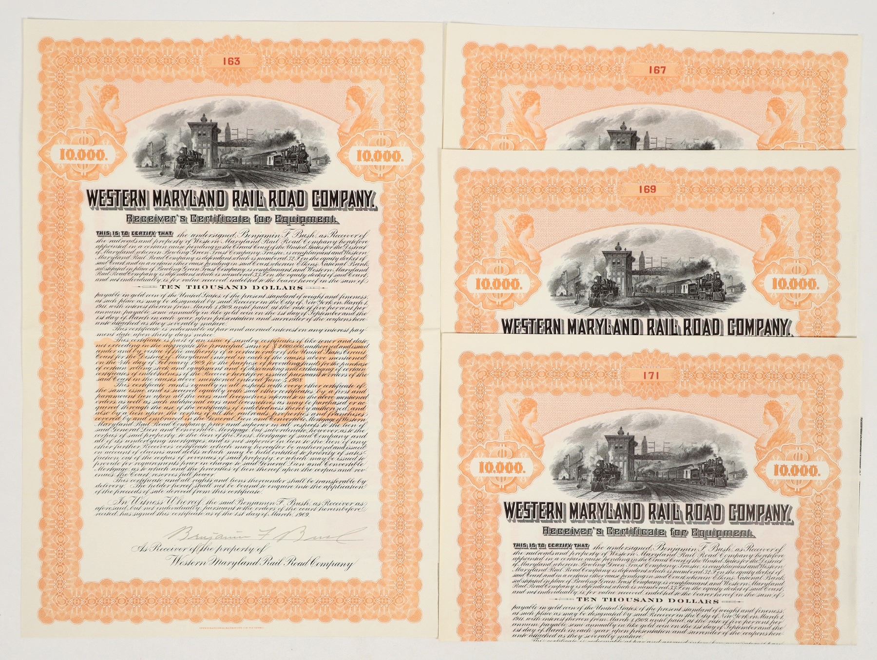 Group of 4 gold bond certificates from the Western Maryland Rail Road Company, issued 1909. All issued and uncancelled, apparently hand signed by company president Benjamin F. Bush. 3 attached bond coupons on each. Nice locomotive vignette, all in good condition; see photos.