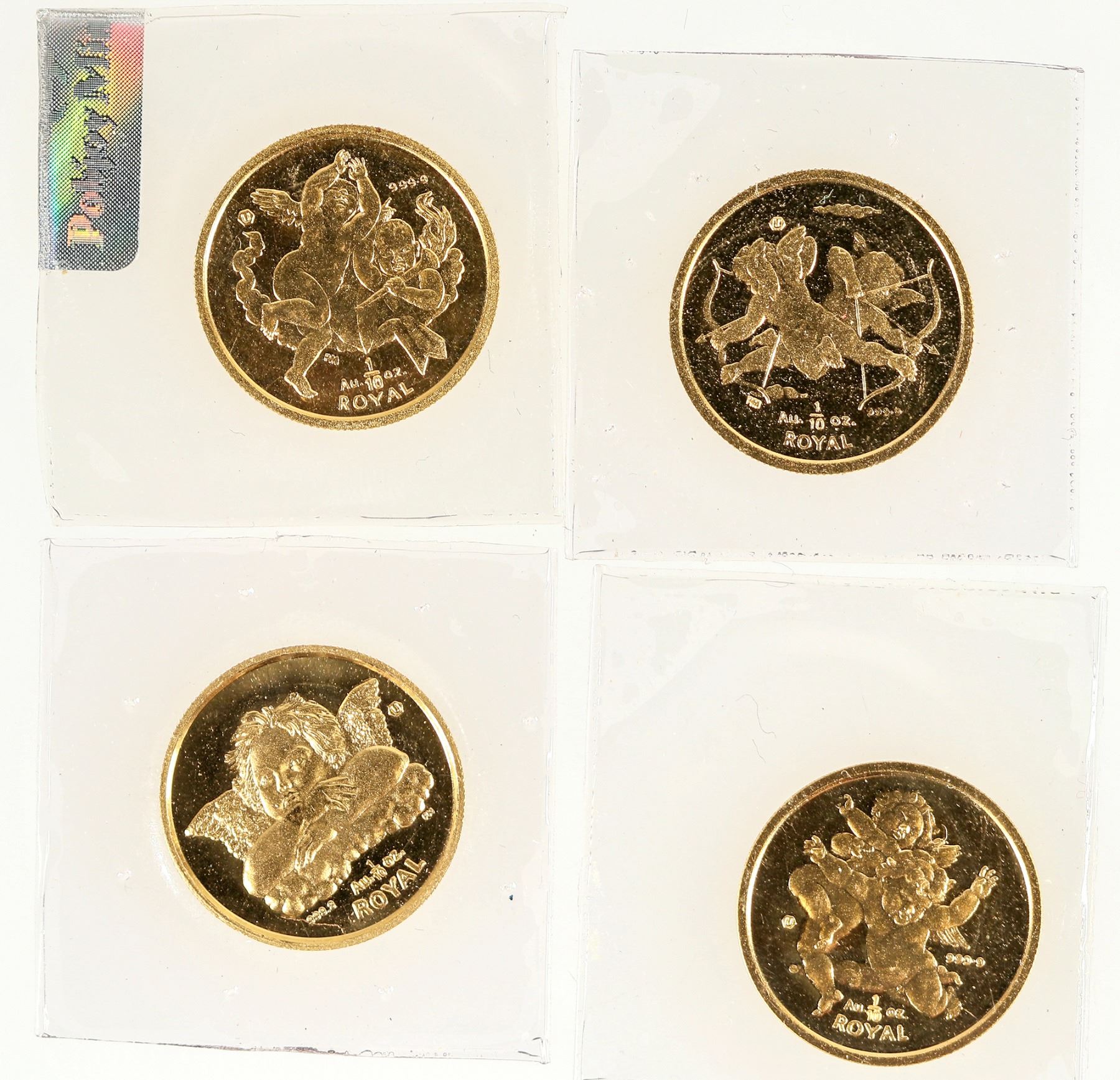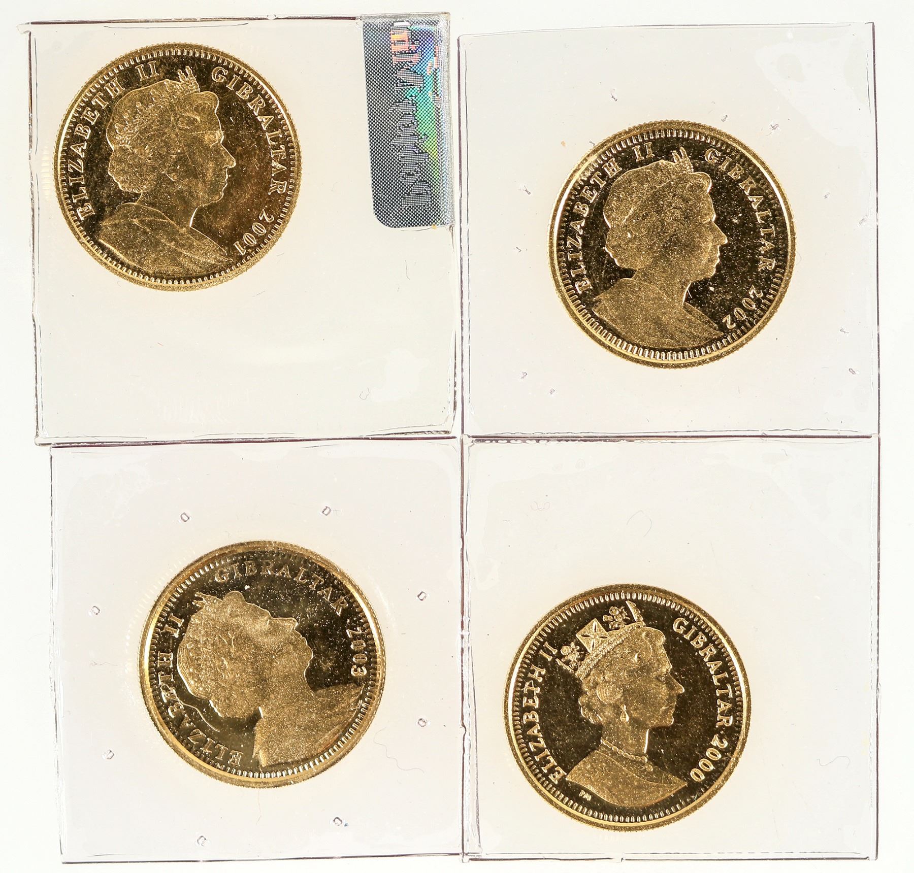 Four 1/10 ounce gold coins made by the Popjoy Mint for the British Overseas Territory of Gibraltar. Dated 2000, 2001, 2002, 2003. Obverse of Queen Elizabeth; reverse are cherubs in different poses each year. Composition: gold (.9999); weight 3.11 grams; diameter 17.95 mm.