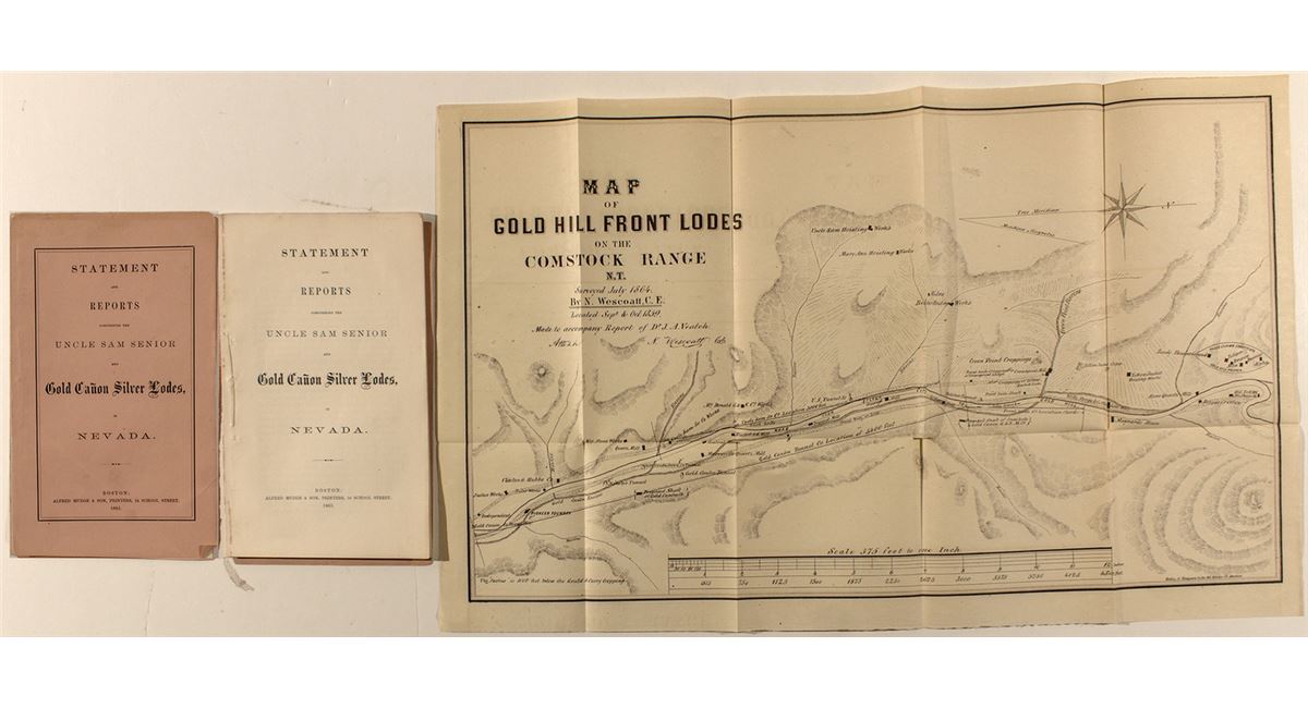 Statement & Reports concerning the Uncle Sam Senior and Gold Canon Silver Lodes in Nevada. Printed by Alfred Mudge & Son, Boston, 1865. Complete with fold out map of Gold Hill Front Lodes on the Comstock Range, Nevada Territory. Surveyed July 1864. Very rare publication.