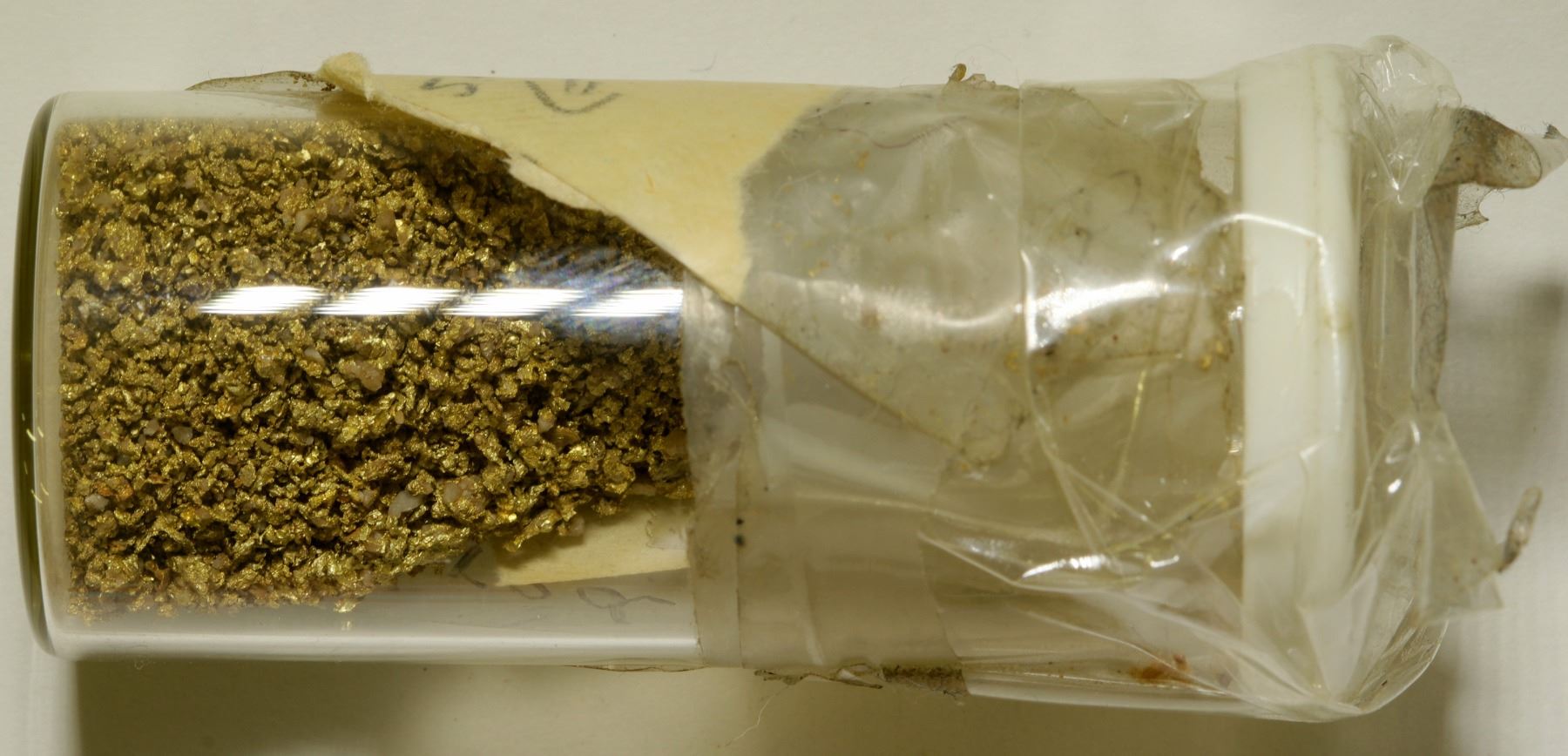 About 32 gr of placer gold from Gold Canyon, the site of the first gold discovery for the Comstock. From the Reeve Collection. Johntown, which was just downstream from Silver City, hosted about 20 cabins in the 1850's. Placer mining continued into the twentieth century, and today the piles of gravel are still evident.