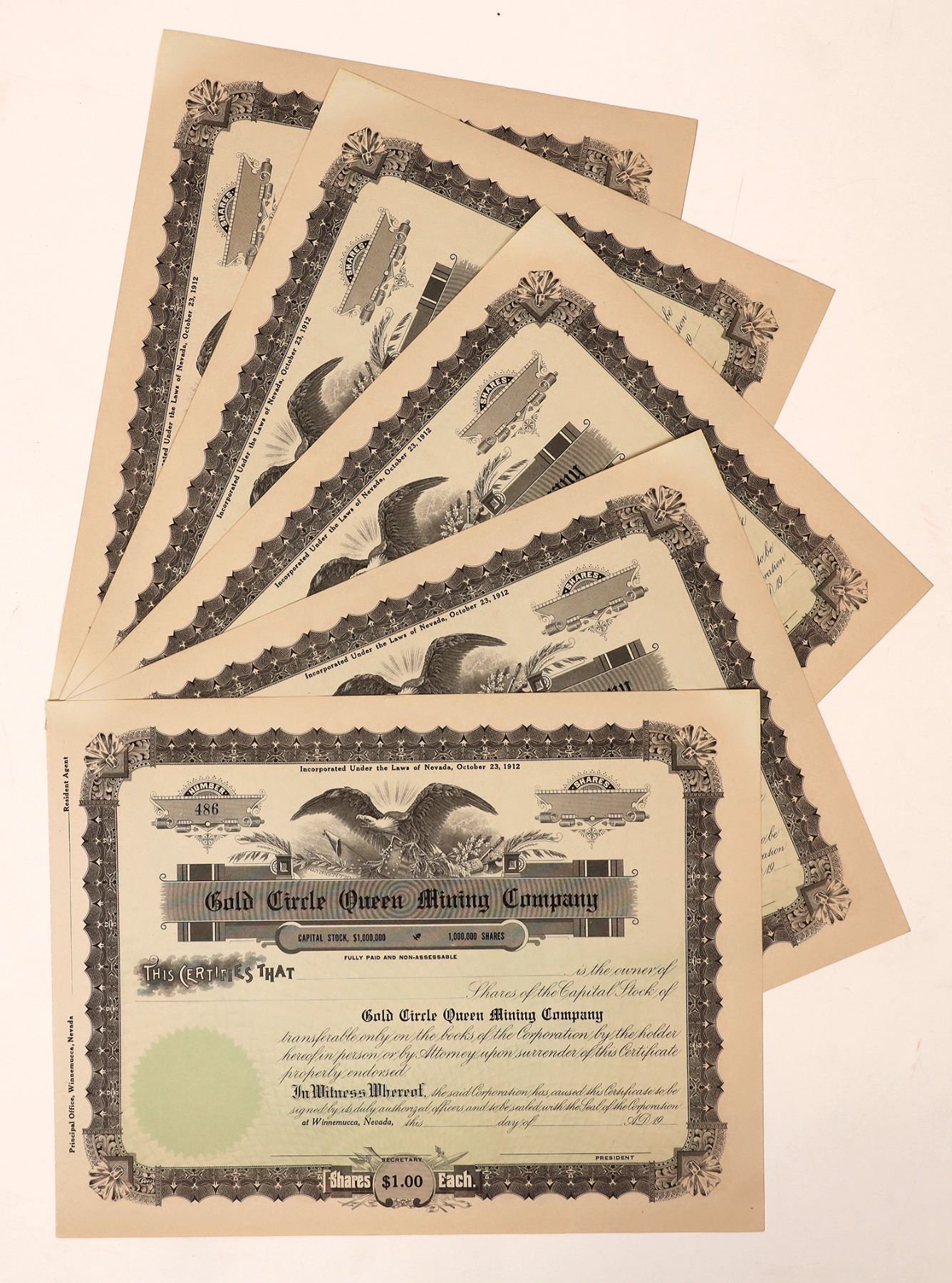 5 unissued Gold Circle Queen MC stocks. Mine located in Midas.