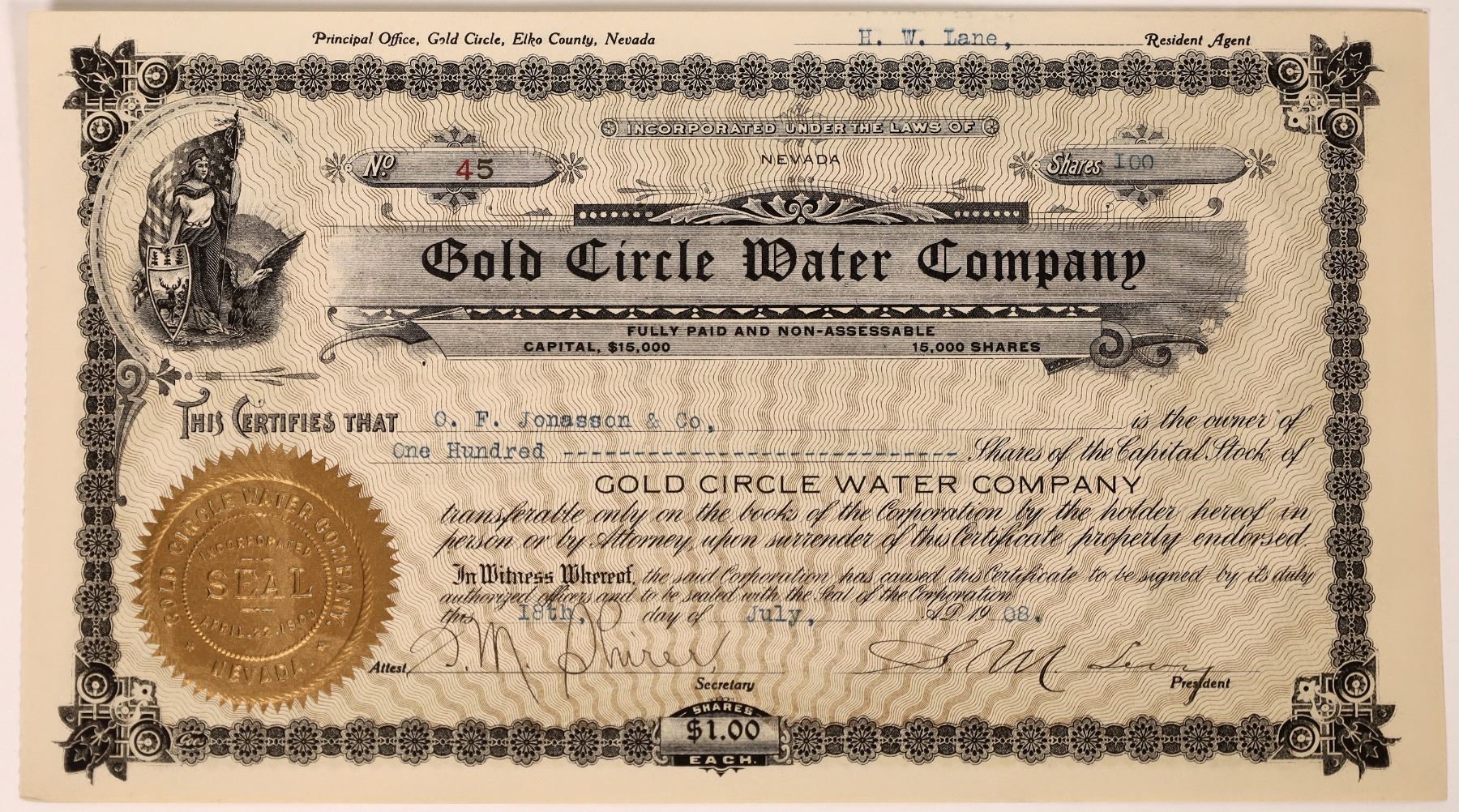 Pristine Gold Circle Water Company uncanceled stock certificate, from Gold Circle (Elko County), NV, (became Midas, NV, in 1909), issued in 1908. No. 45, 100 shares issued to O.F. Jonasson & Co., signed by President S.M. Levy and Secretary F.M. Shirer. 10" x 5.5", company embossed gold seal, ornate border and vignette of Greek inspired man holding American flag and shield, with an eagle next to him.