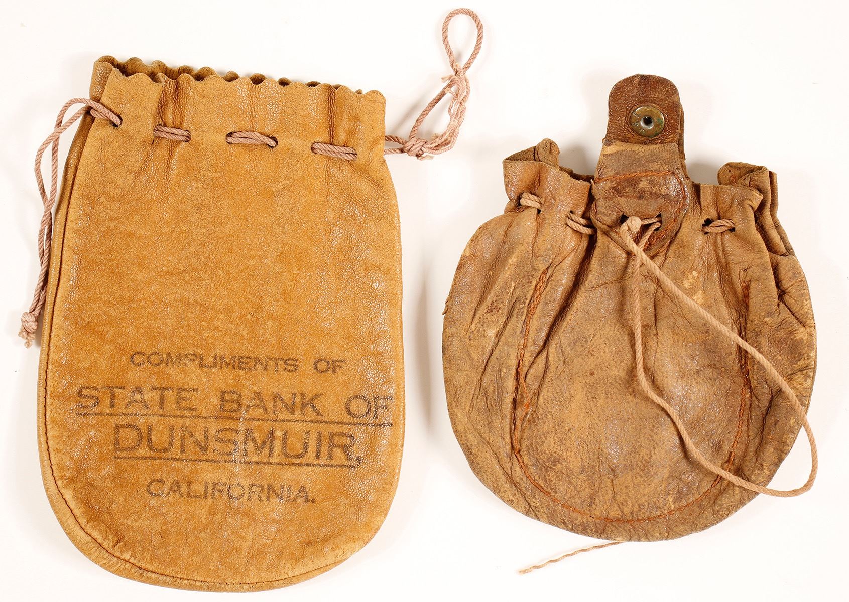 Two leather Bank Bags used by miners to store their Gold Coins. One from Dunsmuir State Bank. Date: Location: California HWAC# 64172