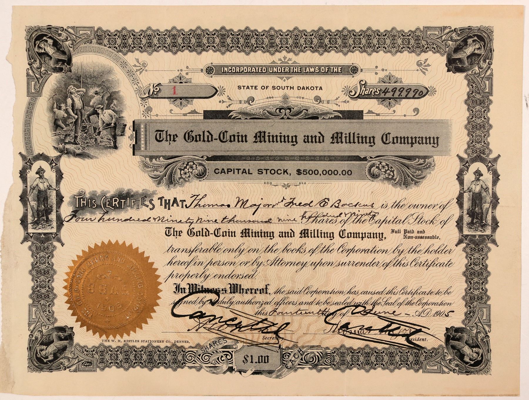 Inc. in South Dakota. Stock number one, issued to Thomas Major (company president) and Fred Backus for 499,990 shares (all but 10) on June 14th, 1905. Signed by Major and the secretary (illegible). Pen cancelled. Black border and print, gold seal, and multiple mining vignettes. Folds, rough left border with portion missing. 8.25 x 11" Possibly Searchlight, Nevada. A June 5th, 1905 Los Angeles Times article mentions a Gold Coin Mining & Milling Company at Searchlight and operating the Sazarac group. Heizer Estate