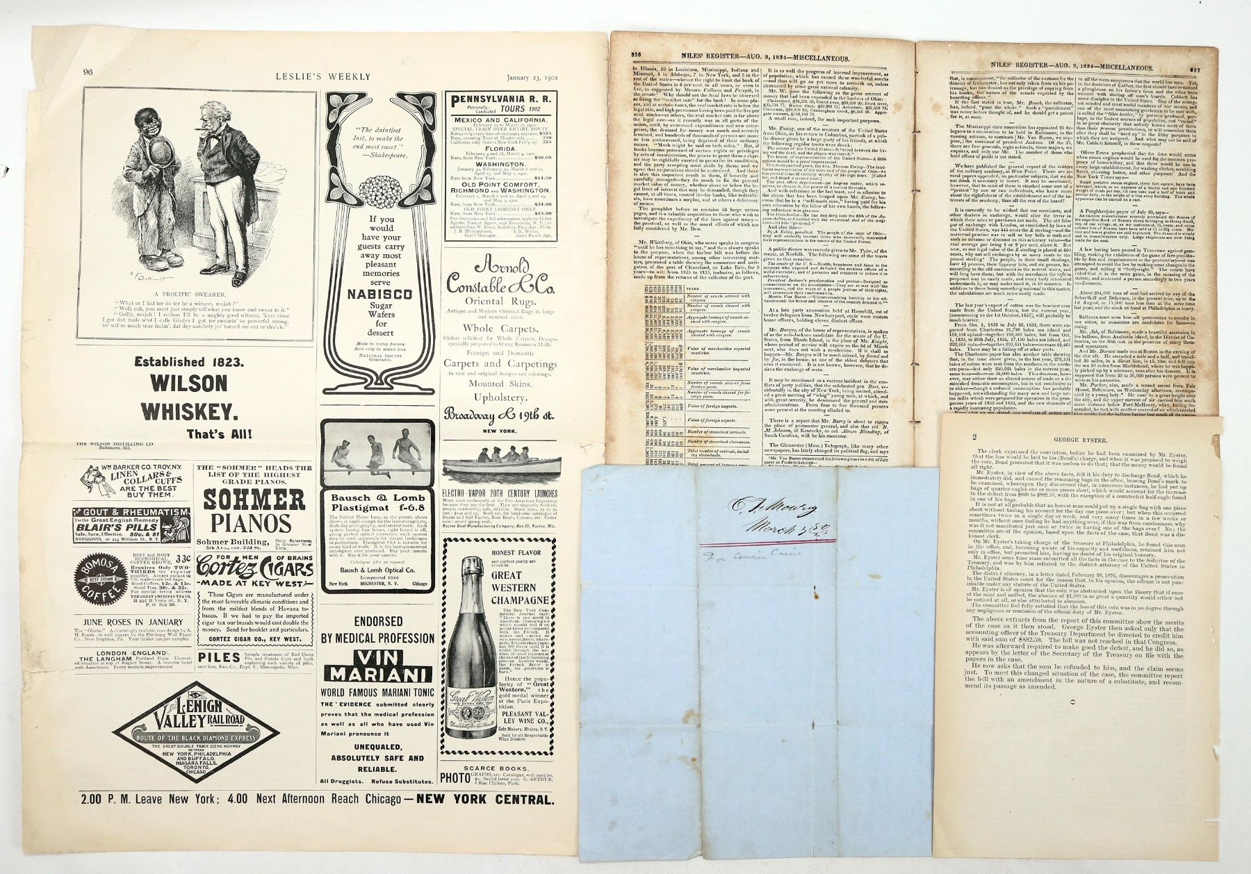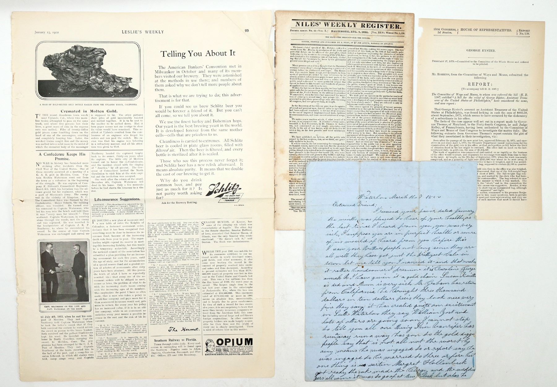 Four different documents with interesting mentions of gold coins: 1) 1850 handwritten letter about a fellow running away to the gold diggings and a "Mr. Graham has returned from California. He brought three thousand dollars in ten dollar pieces... they say it has created quite an excitement..." 2) January 23, 1902 page from Leslie's Weekly with an article entitled: "Cremated In Molten Gold." Concerning a train wreck in Uplands, California where piles of $20 gold pieces came tumbling down on the head of one of the messengers, crushing and completely burying him. Later the wrecked trains caught fire and the money was melted into a solid mass in the midst of which the cremated body of the messenger is supposed to lie. A picture of the mass of half-melted gold double eagles as well. 3) 1834 Niles' Weekly Register discussing the weight change in the 1834 Classic head gold coins. 4) Treasury Report regarding case of Geore Eyster at the Treasury, 1879.