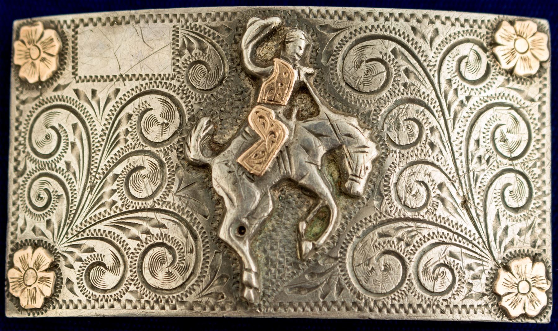 Rectangular sterling silver vintage western belt buckle. Planchette is etched with some intricate patterns, a stitched like border and light pink 10 K gold flowers in each corner. The cowboy is riding a bucking bronco. He is holding his hat up in the air. He is wearing a pair of light pink 10 K chaps and a light pink 10 K gold vest. Piece weighs: 65.4 grams. SIZE: 3" x 1.75". In excellent condition. Stamped on back of planchette: "Guaranteed sterling 10 K Mexico." State: City: HWAC#: 48229 Date: