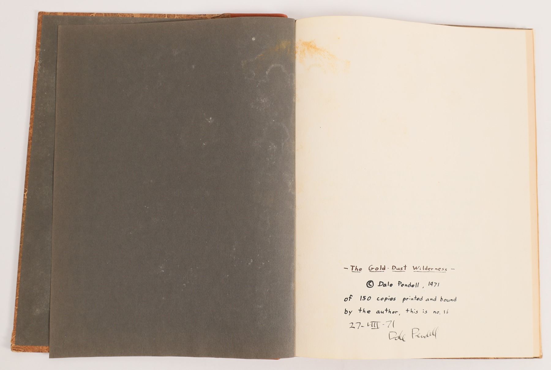 Very rare The Gold Dust Wilderness by Pendell, #16/150, signed by author. 1971 70pp. Boards have some wear. "My first book, mostly written while living in a tiny cabin at Flores Flats in the mountains above Santa Barbara in 1970. It is a book of haibun of my life on a mining claim on the North Fork of the Trinity River between 1967 and 1970, and illustrated with pictographs and petroglyphs. Its a hand-made book, printed by silk-screen process in a small garage in Santa Barbara, and hand bound using flexible sewing while Jon and Judy Winter fed me and let me sleep in their yard. I printed a hundred and fifty copies, washing out the screens as I went along." from dalependell.com 1971