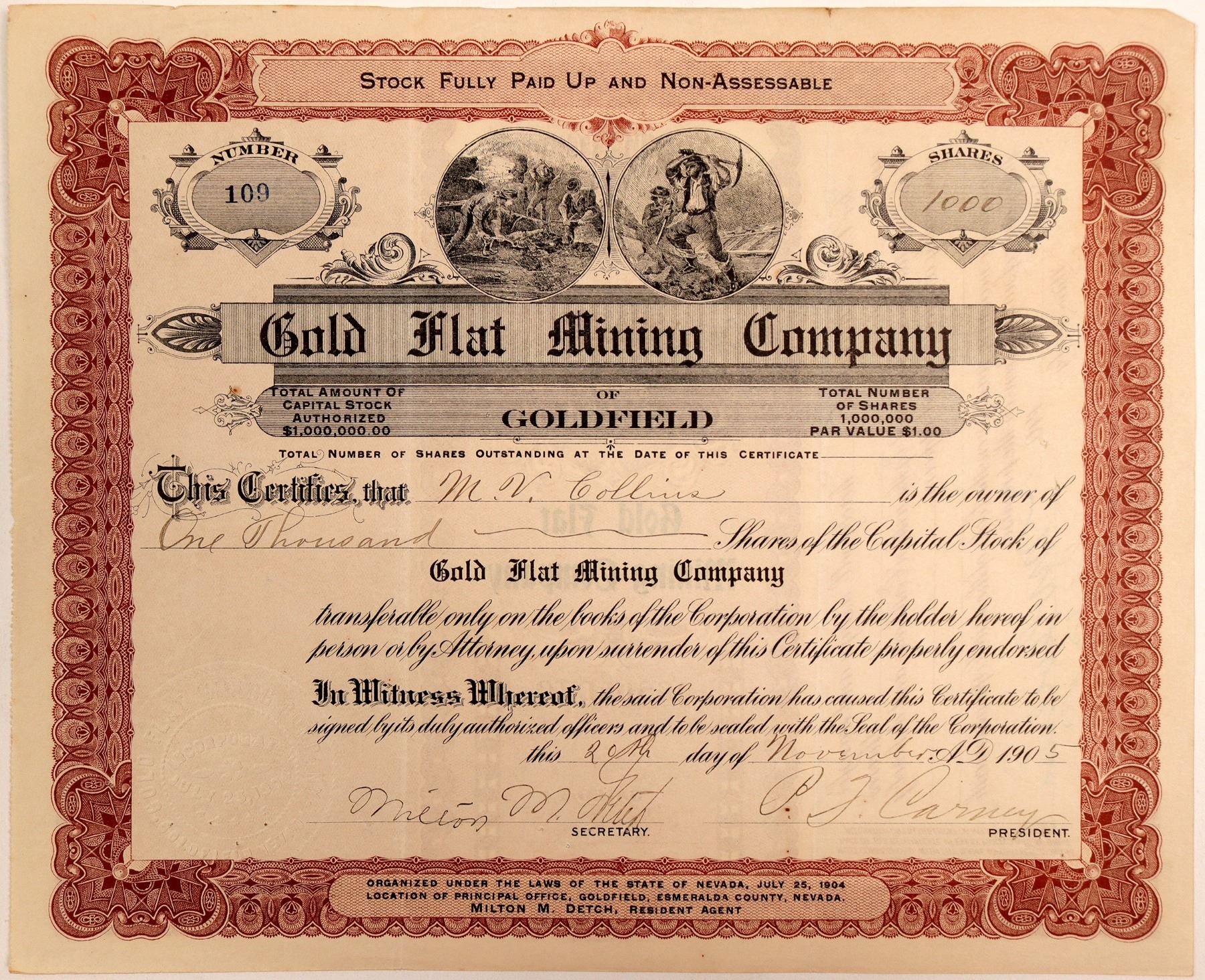 We have not seen this location (Gold Flat) before. According to Preserving the Glory Days: Ghost Towns and Mining Camps of Nye County, Nevada, Hall, Gold Flat was located 3 miles west of Quartzite Mountain (now inside the Nellis Air Force Base Gunnery Range). Located around Pahute Mesa, Gold Flat was originally known as Nixon. Nixon, Wingfield, Oddie and Davis owned 32 claims nearby but abadoned a townsite when the claims proved to be worthless. It was renamed Gold Flat in February 1905. It never developed past a tent camp. Stock No. 109, issued for 1,000 shares to M.V. Collins on Nov. 20th, 1905. Signed by president P.J. Carney and the secretary. Not cancelled. Maroon border, black print, two mining vignettes. 8.25 x 10" Folds, pinholes, paperclip indentation. Ken Prag Collection
