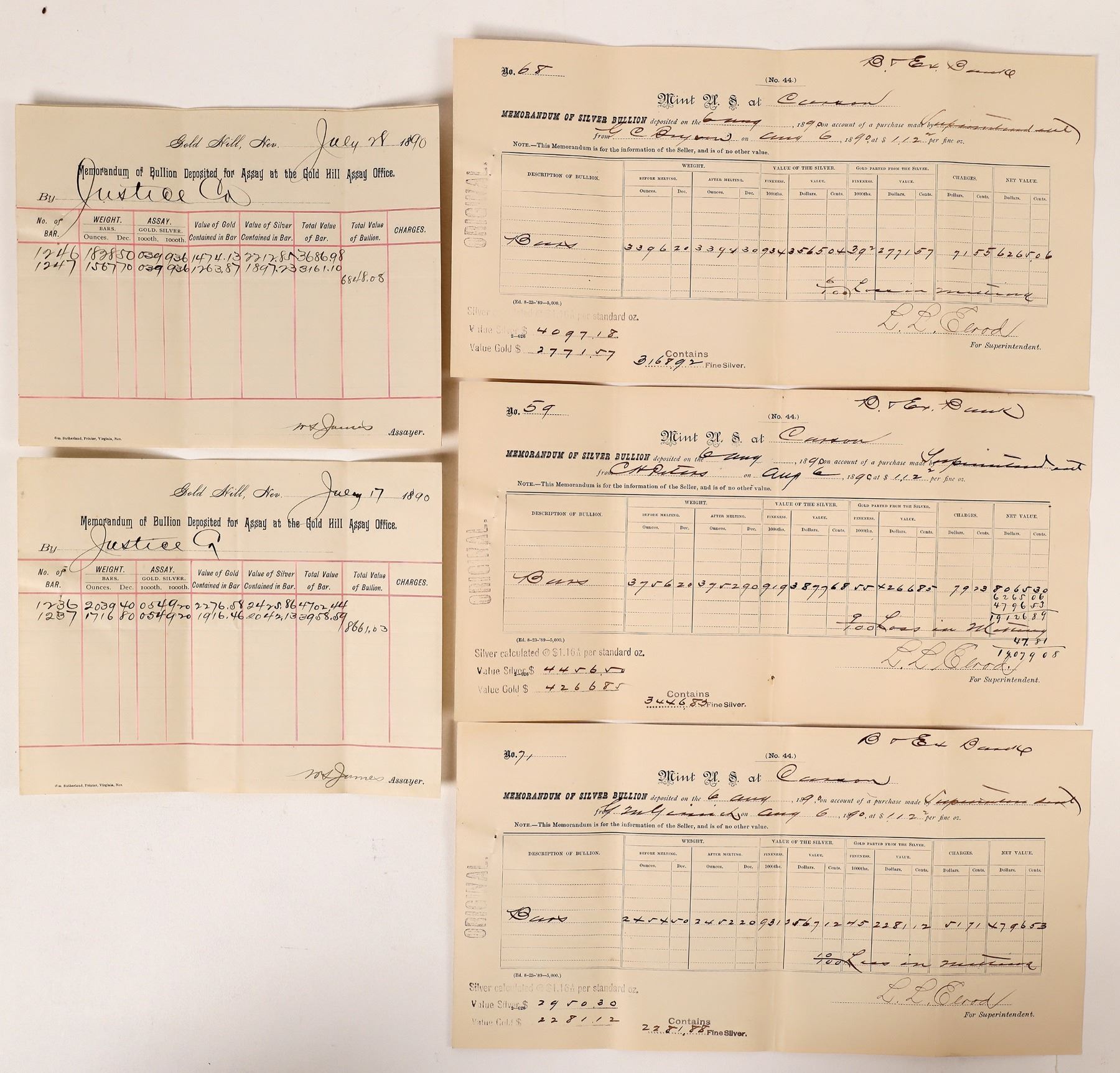 Lot of 6 documents attached to each other. Includes 3 Gold Hill Assay Office memorandums and 3 Carson City Mint Silver Bullion memorandums. The bullion was assayed for the Justice Co. in July 1890. Six bullion bars were produced, ranging in size from 900 to 2,000 ounces each .920-.933 silver fineness. Nearly 10,000 ounces total. Corresponding Carson City Mint forms are for deposits of this bullion by CH Peters, GC Byron, and one other--likely the owners of the Justice Mine which was located in Silver City one mile NW of Devils Gate, staked in 1859. All CC Mint forms signed by LL Elrod for the superintendent. The CC Mint had stopped production from 1885-October 1889. In 1890, the CC Mint produced 2,309,041 Morgan dollars. This is a great group highlighting the journey from Comstock mine to Carson City Mint coin press.