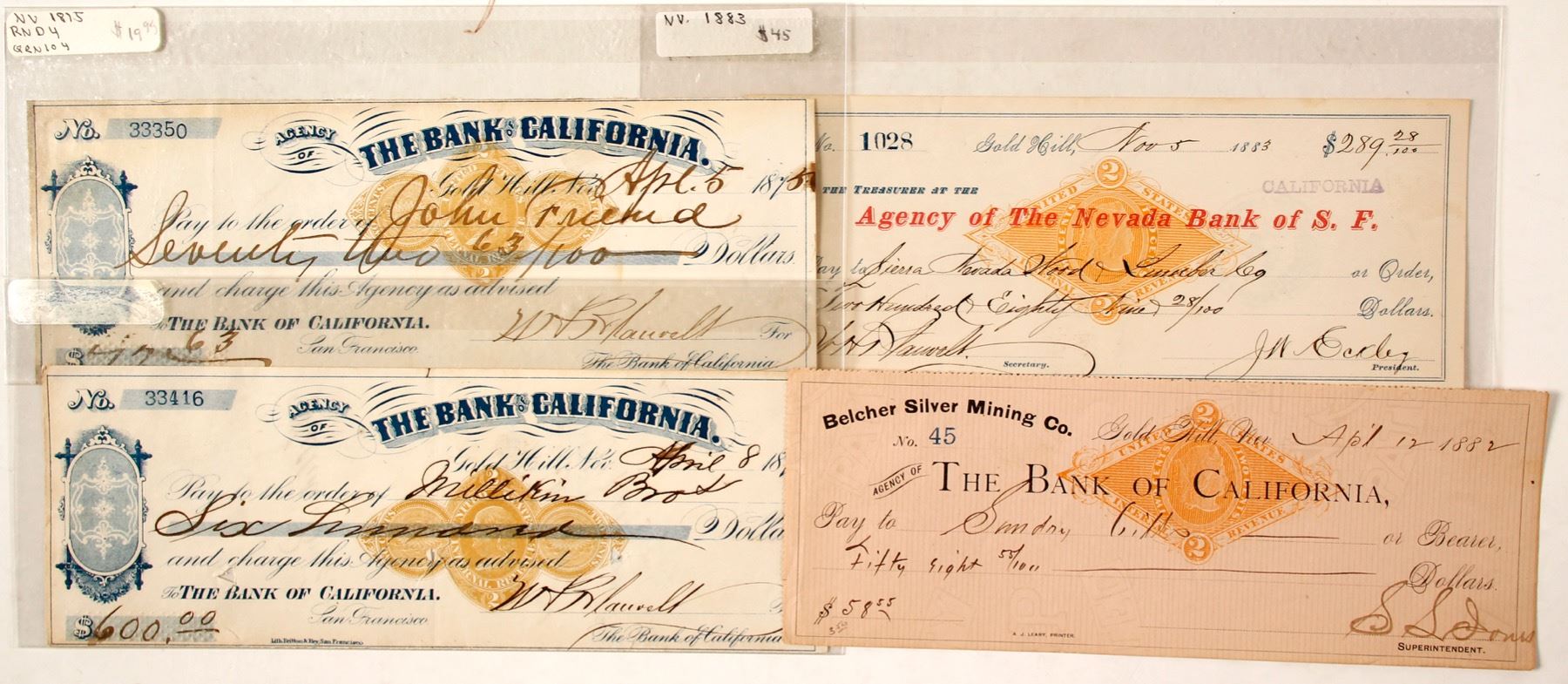 Extra Rare Belcher Silver Mining Company, Gold Hill Nevada, April 12, 1882, No. 45 from the Bank of California payable to Sunday Gills(?) signed by Superintendent S.S. Jones. (off Color) Revenue Stamps; 2) Agency of the Nevada Bank of S.F., No. 1028 for $289.28, payable to Sierra Nevada Wood & Lumber Co., signed by President J. W. Eckley (off color); 3)No. 33416 Agency of The Bank of California, April 8, 1875 payable to Millikin Boot(?) for $600.; 4) No. 33350 Agency of The Bank of California, Gold Hill Nevada, April 5,1875, $72.63, payable to John Friend. Revenue Stamps. State: California City: Gold Hill Date: 1883 HWAC# 84422