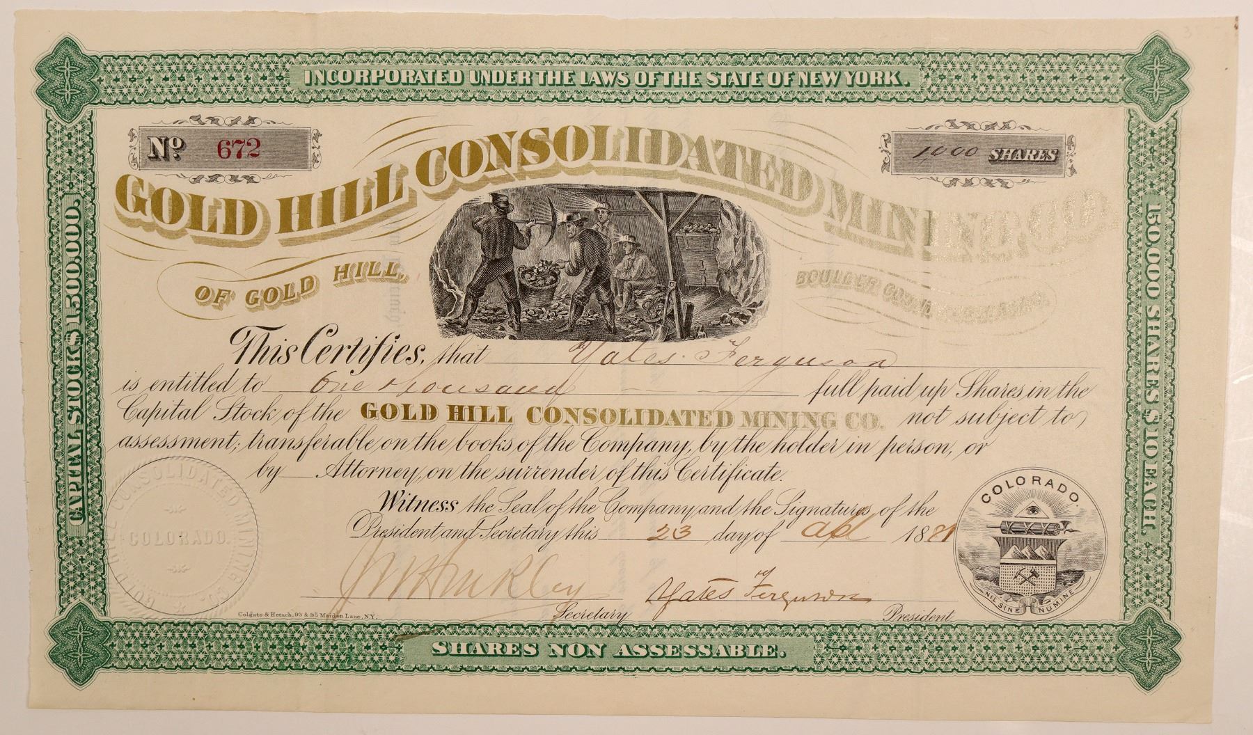 "of Gold Hill, Boulder County, Colorado." Inc. in New York. No. 672, issued for 1,000 shares to company president Yates Ferguson on April 23rd, 1881. Signed by Ferguson and the secretary. Not cancelled. Green border, gold title, and black print. Two vignettes: mining (top center) and Colorado state seal (bottom right). Printed by Colgate & Hetsch, NY. Heavy folds, clean. 6.75 x 11.5" Not listed in C&L. The Leadville Weekly Herald, April 17, 1880, reports multiple claims being sold to the company in the Ten Mile District, including the Argenta, Little Maud, Snow Drift, Snow Flake, Zollars, and more. Articles in Dec. 1880 refer to litigation being settled. The Georgetown Courier February 17, 1881, reports the company has just finished its first month of work and has seen good results. Ken Prag Collection