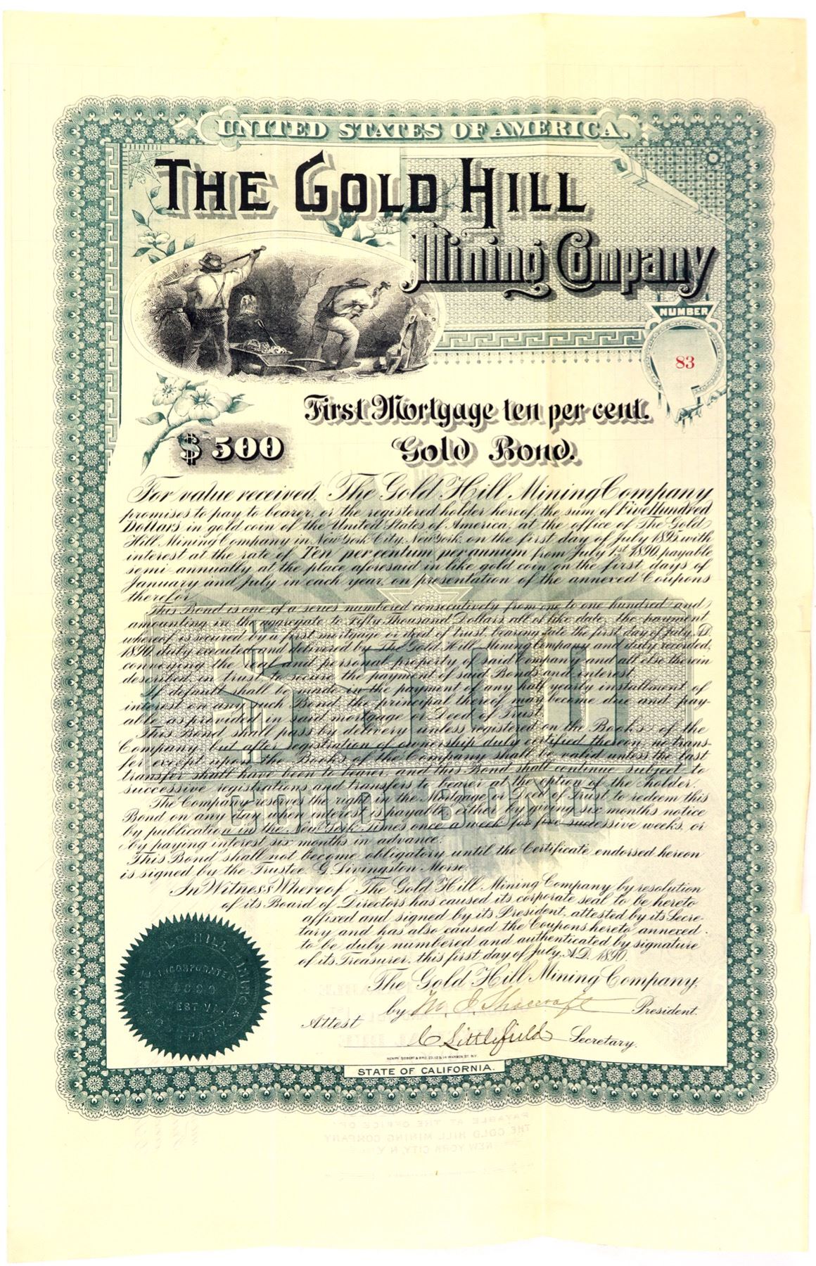 No. 83, issued for $500 in 1890. Four coupons attached. Signed by president Shorcraft(?) and secretary Littlefield. Not cancelled. Green border and seal, black print and mining vignette. Folds, a few tears along edges. 17 x 11" This company was formerly the Nevada City Gold Quartz Mining Company. According to California Journal of Mines and Geology, Volumes 12-13 (1894), it was located 1.5 miles north of Nevada City with 38 men employed working above the drain tunnel. City:Nevada City State:California Date:1890