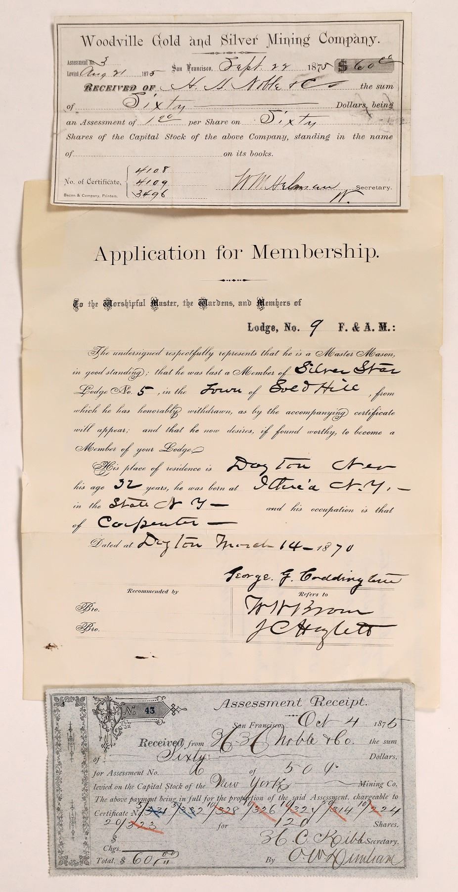 Lot of 3. 1. Application for membership in lodge 9 F. & A.M., dated 1870 by Master Mason and favorably accepted. Cond. F. 2. Woodville Gold and Silver Mining Co. assessment receipt #3 from H.H. Noble & Co. on shares issued Sept 1875. Signed by secretary, 3. Assessment receipt H.H. Nobel & Co. on stock of New York Mining Co. issued Oct 1875. Black border on blue paper.
