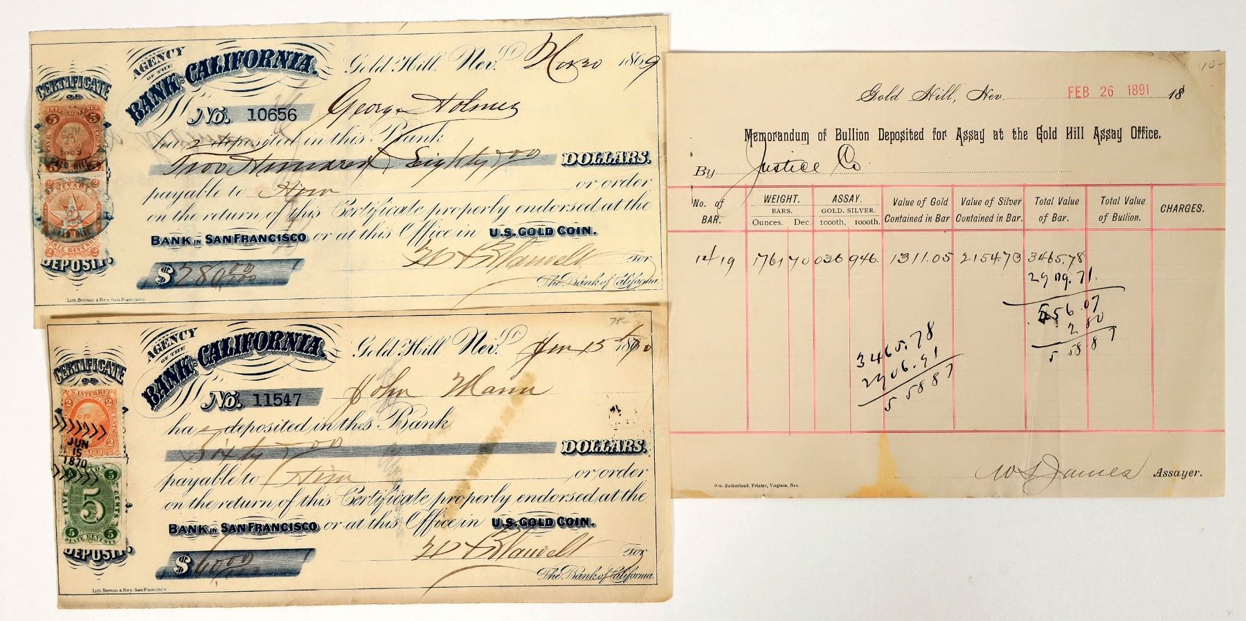 Lot of 3. Includes: Gold Hill Assay Office, 1891, bullion deposited by the Justice Mine; and two Bank of California deposit slips, 1869 & 1870, each with different Nevada revenue stamps.
