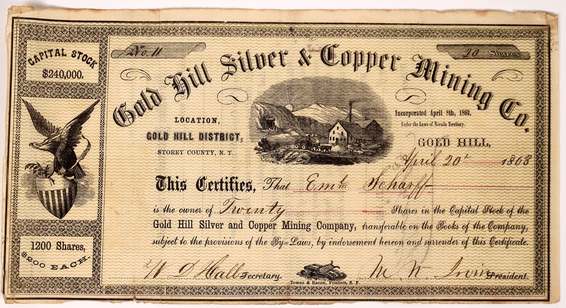 Gold Hill Silver & Copper Mining Co. - Gold Hill District, Storey County, N. T. -Certificate No. 11 for 20 shares to Emil Scharff datelined Gold Hill on April 20th, 1863. Incorporated on April 8th, 1863, and capitalized at $240,000; 1200 shares at $200 per. Signed by President, M.N. Irwin and Secretary, W. D. Hall. Vignette of an eagle at left and mining operation top center. Town & Bacon Printers.