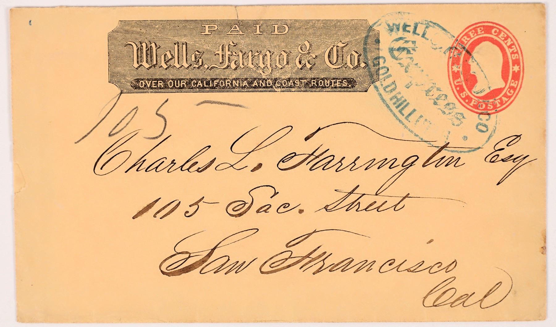 Wells Fargo & Co. Express, Gold Hill Utah blue oval handstamp on fresh 1860, 3¢ Star Die entire to San Francisco, Cal., black company frank at top. Addressed to Charles L. Farrington at the location of H. Harris, Assayers in San Francisco at 105 Sacramento St. where he was employed. Farrington was a cofounder of Harris & Marchand's Assay Office in Sacramento. This was the firm that lost gold ingots in the sinking of the S.S. Central America in 1857. He was also a founder of the Alta Express. Small cover tear at top, otherwise very fine. Ex. Schuyler Rumsey, Sale 41, Lot 809. Nevada Territory would not be formed until March 1861.