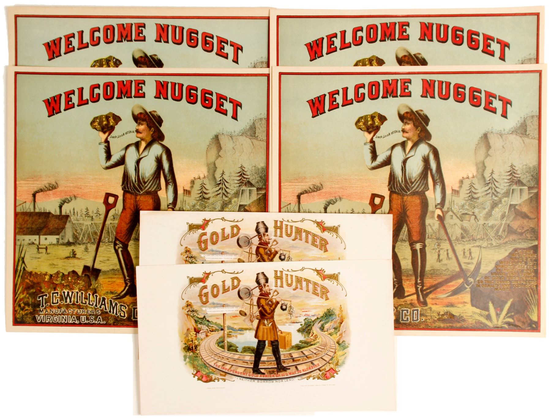 Lot of six: two 10 x 6 inch: Gold Hunter / The Independent Gold Hunter on his way to Klondike. Four 11 x 11 inch: Welcome Nugget / T.C. Williams Co. / Manufacturers / Virginia, U.S.A. City: State: Date: HWAC# 81305