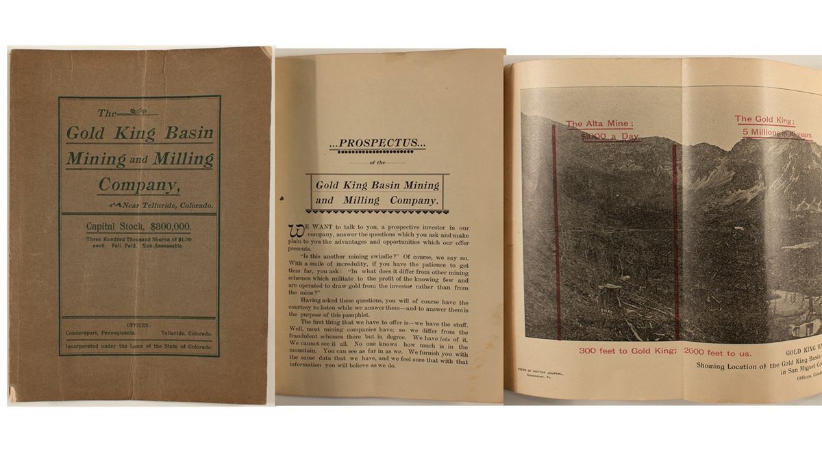 c. 1903. Prospectus for The Gold King Basin Milling and Mining Company. Seven pages plus fold-out black-and-white photograph showing company properties. Measures approx. 6” x 8 ½.” Brown covers. Printed by Potter Journal, Coudersport,PA. Prospectus starts with an interesting question: “Is this another mining swindle? Of course, we say no.” They confidently state, “we have the stuff.” The company has five mining claims comprising fifty acres and a mill site comprising five acres. Prospectus has a playful tone, with lots of questions and answers. Ends with a good summary of the mining industry: “Mother Earth denies some; others she makes immensely rich. If you are inclined to take a chance with us in our game with her, you may lose what you put in, you may win a fortune.” Condition: deep vertical fold through center of prospectus. Most pages heavily toned. Tears and missing pieces from covers.