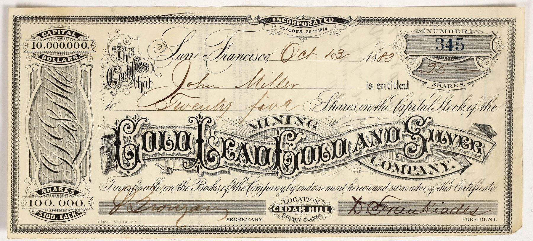 I/U .Gold Lead Gold and Silver Mining Co. Stock, issued 1883, location Cedar Hill Storey County, Nev. E. Bosqui & Co. printer. Cedar Hill is located at the north end of the Comstock Lode.
