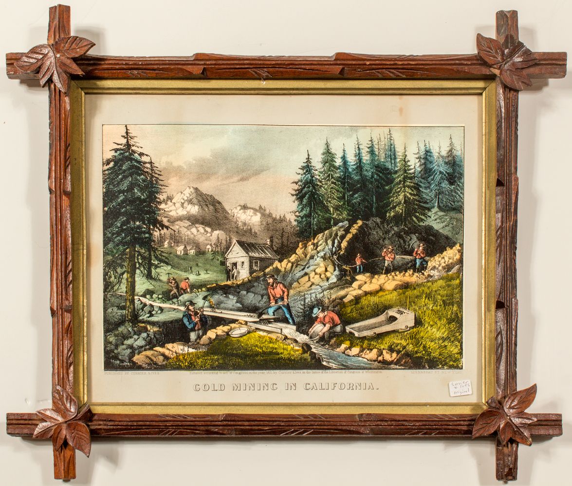 Beautifully detailed, original hand-tinted lithograph printed by Currier and Ives in original frame—13" H x 16" W. The piece shows operations at a California mining camp.