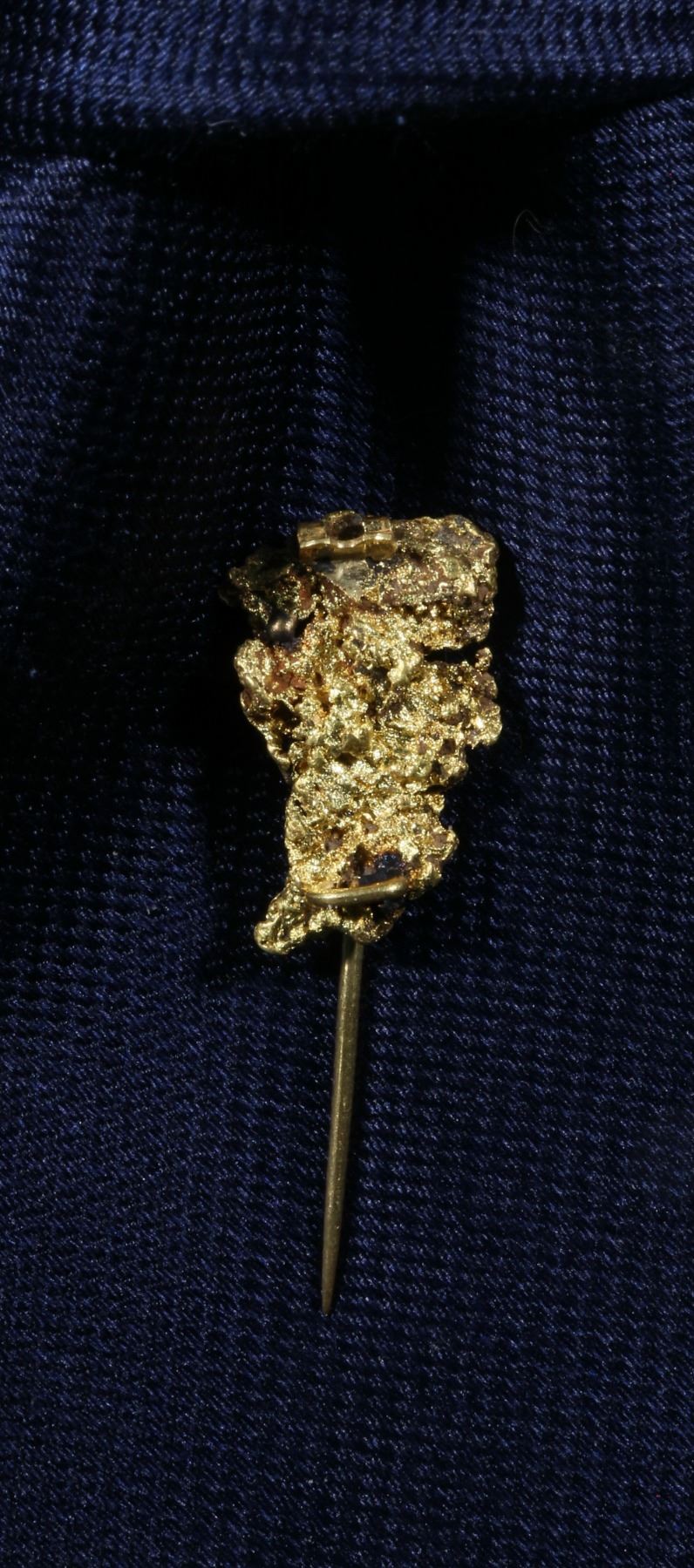Brooch made of a single gold nugget, 22 x 13 mm, 4.0 grams (0.13 ozt). The 30 mm pin was originally attached to a gold hinge onto the back, but the hinge pin holding it together have been lost. It displayed horizontally.