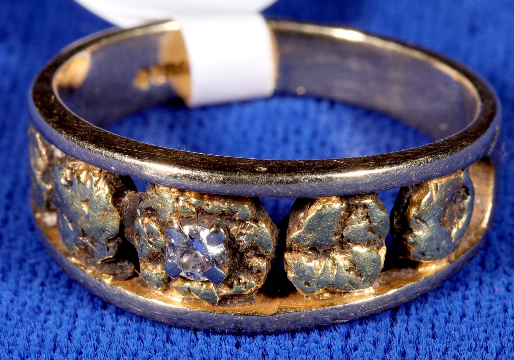 14K gold man’s ring—6.6 g. Features gold nuggets in cut-out settings and center nugget set with round cut diamond. Nice design, size 9.
