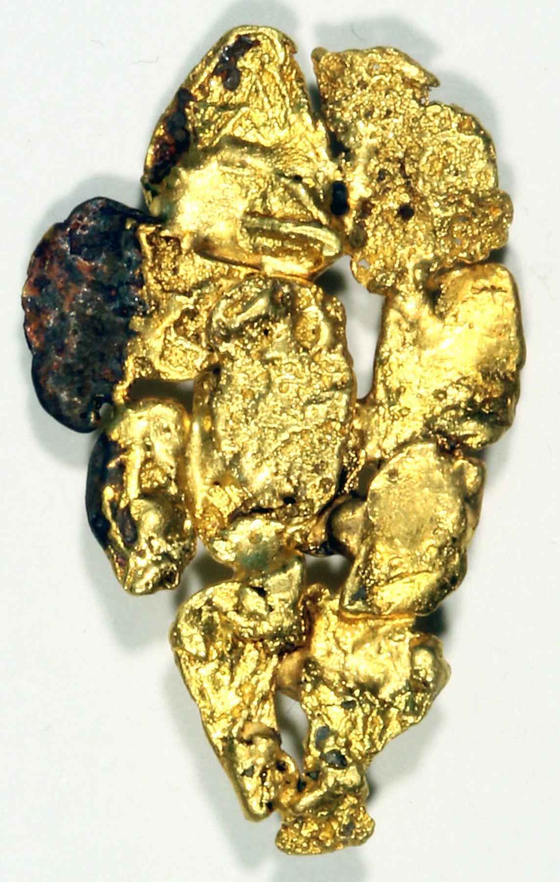 Stickpin made of a single large gold nugget, 32 x 20 mm, 4.5 grams (0.145 ozt). A hinged stickpin was originally attached to a gold hinge onto the back, but the tiny hinge pin holding it together and the stickpin itself have been lost. Shows good crystalline form.