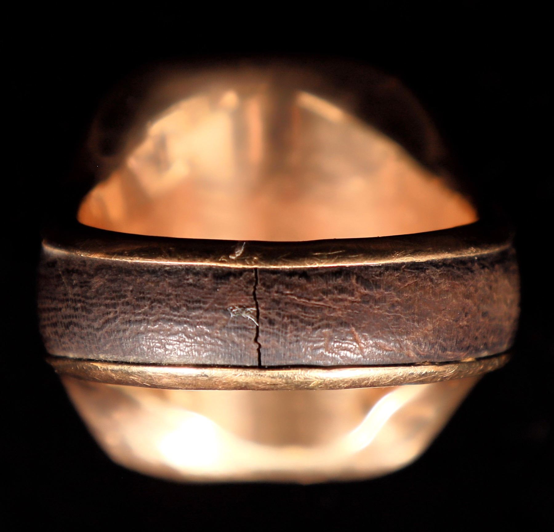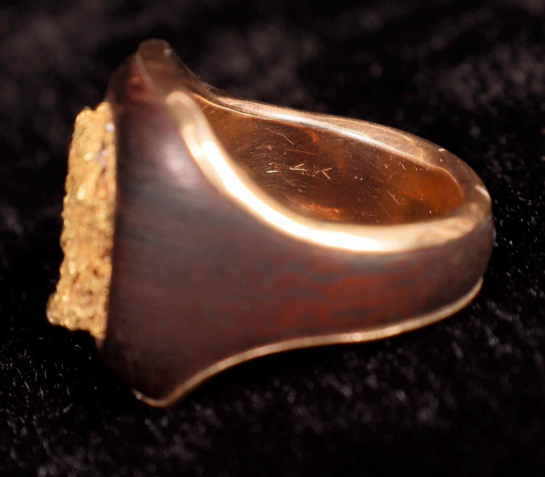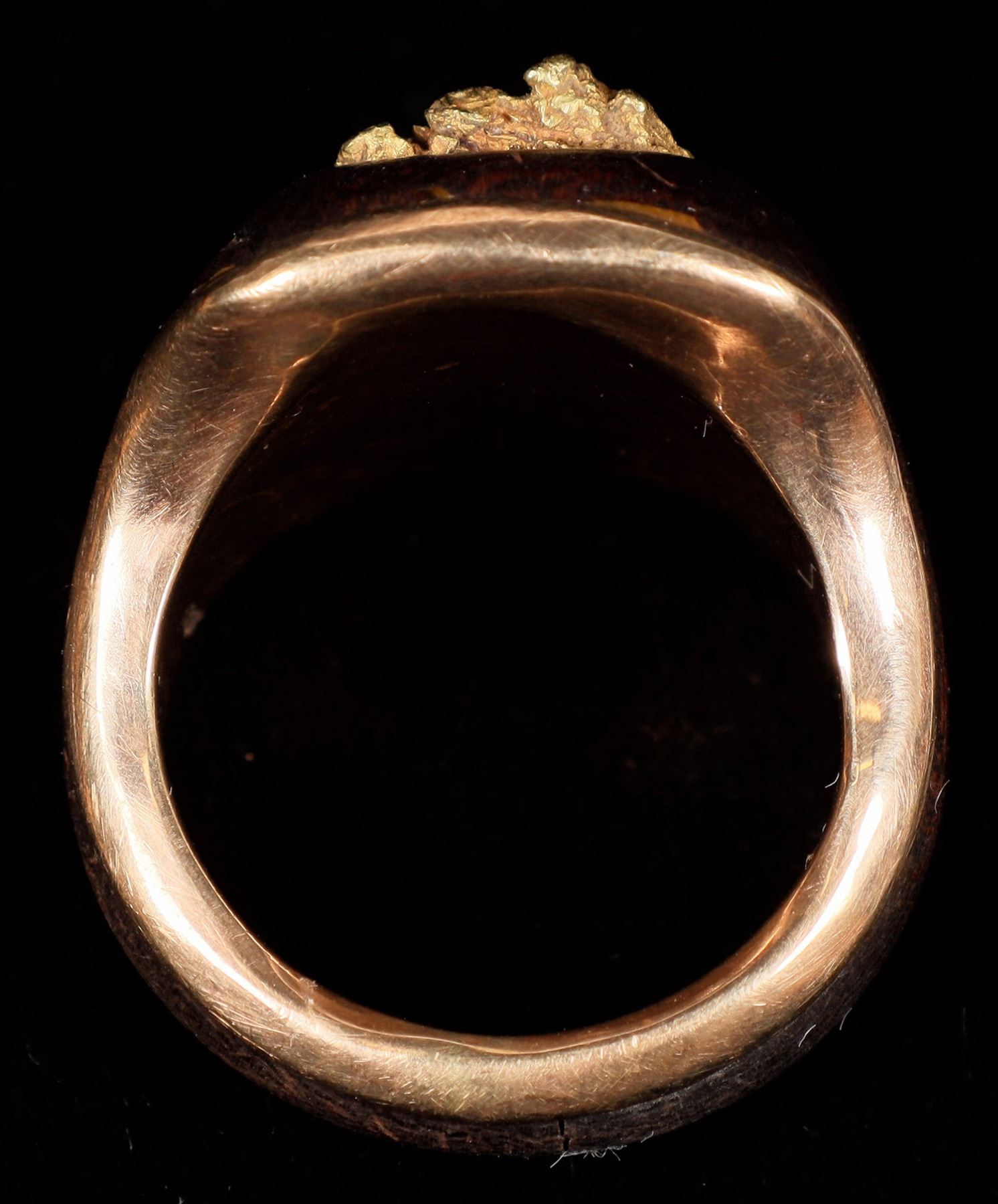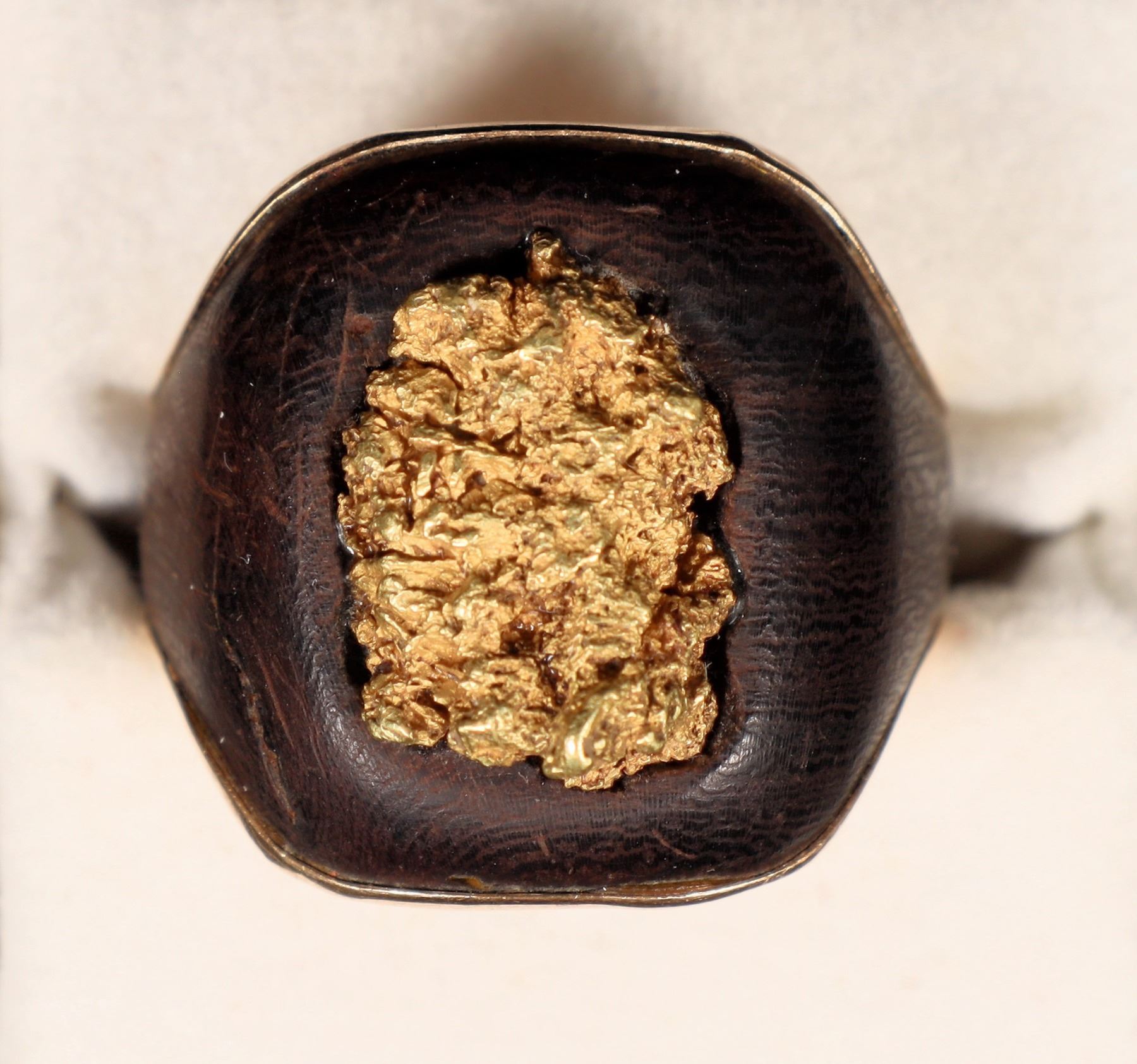 Rectangular gold nugget (11 x 16 mm), set in wooden trim in a 14 carat gold band. Size 8 1/2; total weight 9.1 grams.