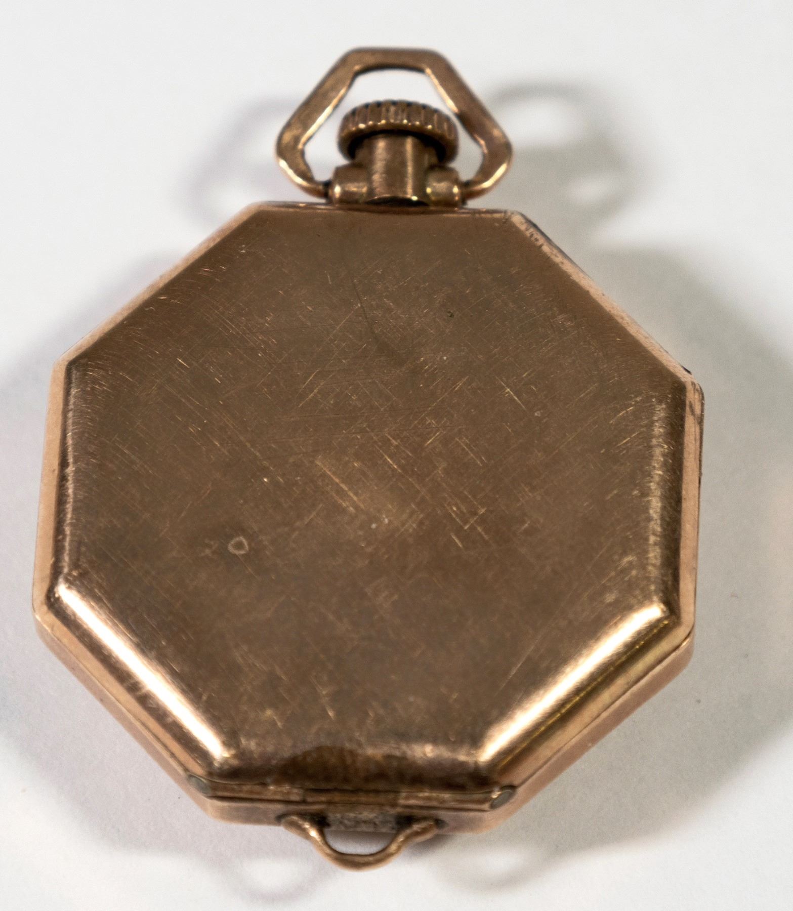 Small gold octagonal pocket watch/pendant. Etched design on edges, face is yellowed, Arabic numerals. No Makers name. watch face--.75". State: City: Date:c1920's Provenance:
