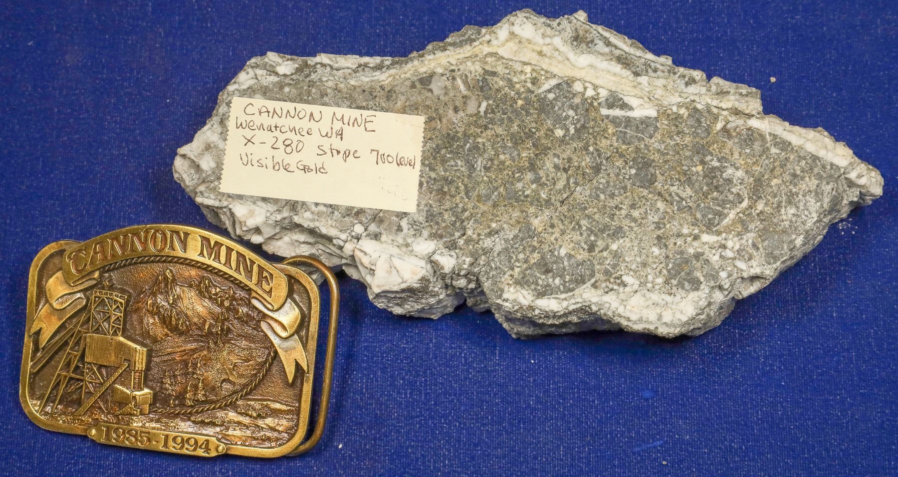 This specimen is a 725-gram slab from a high-grade portion of the Cannon Mine showing the characteristic banded structure with visible gold and electrum (a grayish silver-gold alloy) of the ore. It is approx 7 x 3 x 1.25 inches. This piece is labeled by the collector as from the X-280 Stope, 700 Level. The lot comes with a brass belt buckle commemorating operations at the Cannon Mine from 1985-1994. It shows the head frame set against a bas-relief background of the local mountains. It is number 83 of 250. Made in 1994 by Siskayou Buckle Co, Ashland, Oregon. See other lots of Cannon Mine slabs for a description of the mine.