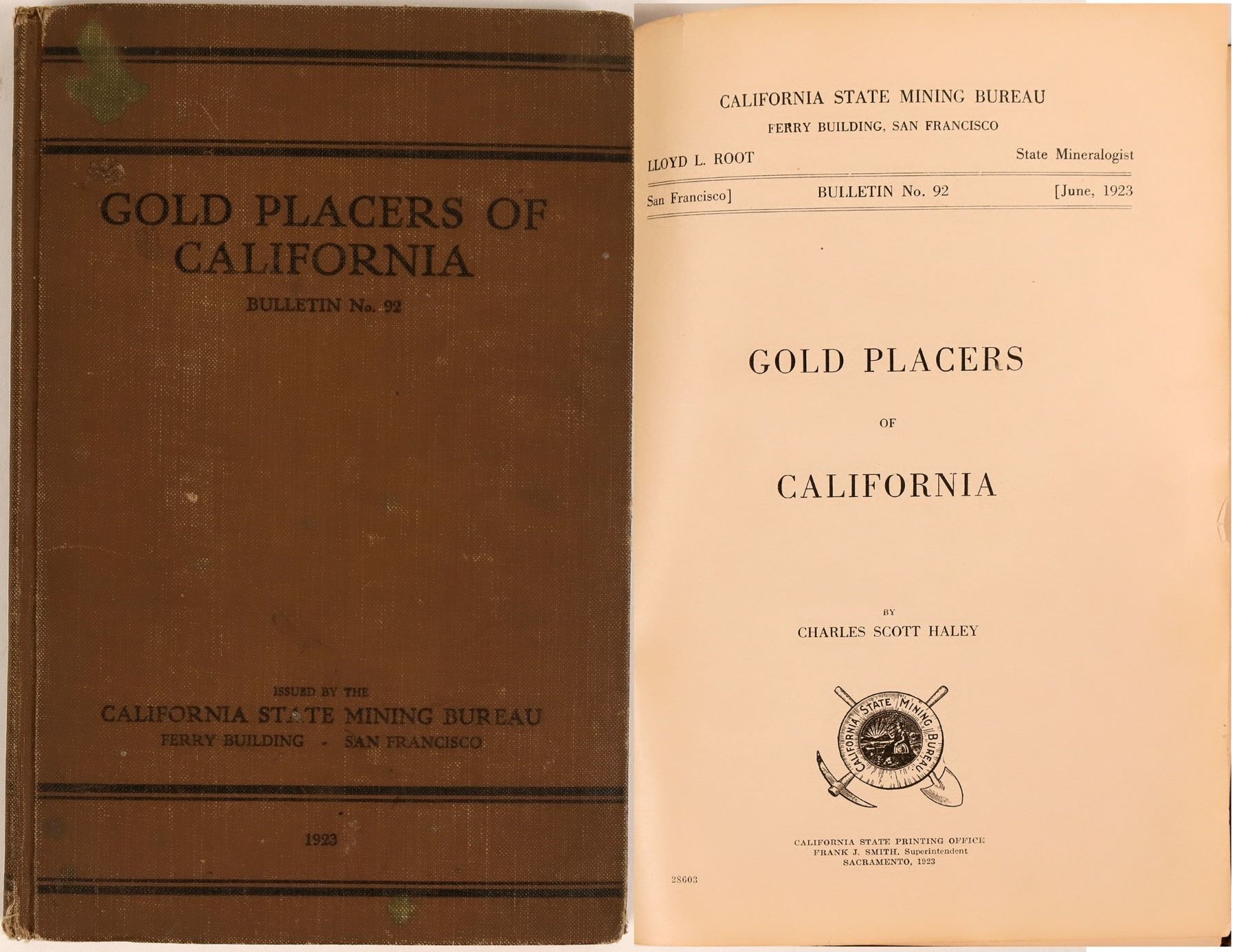 This book is titled "Gold Placers of California" bulletin #92 dated 1923 issued by the California State Mining Bureau by Scott Haley. It includes great plates, maps, and the complete map fold-out in the back of the book! Some worn edges otherwise very good shape.