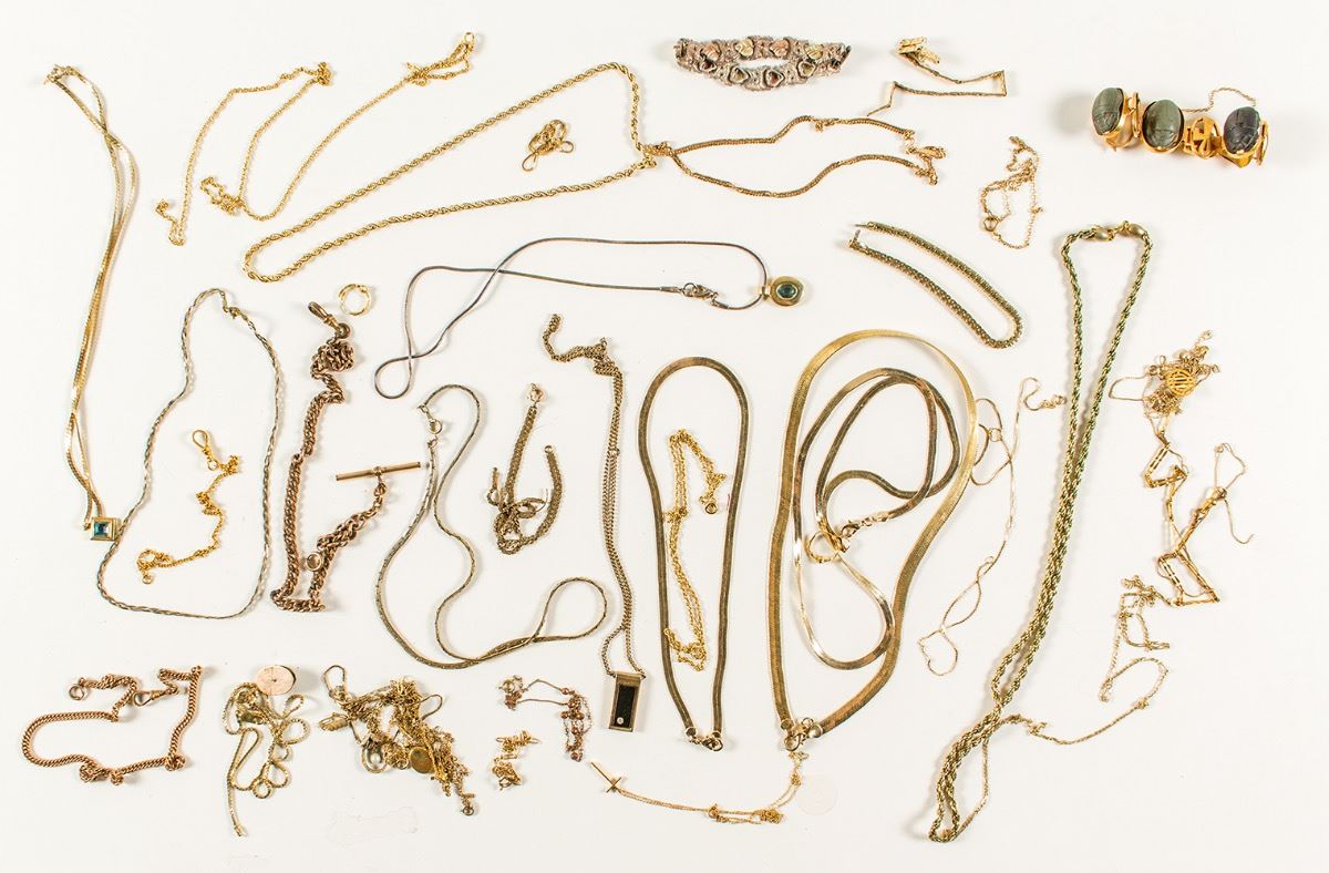Lot includes several necklaces (mostly chains), a few bracelets, and an intriguing Egyptian bracelet with scarabs. City: State: Jewelry Date: Inventory# 38205