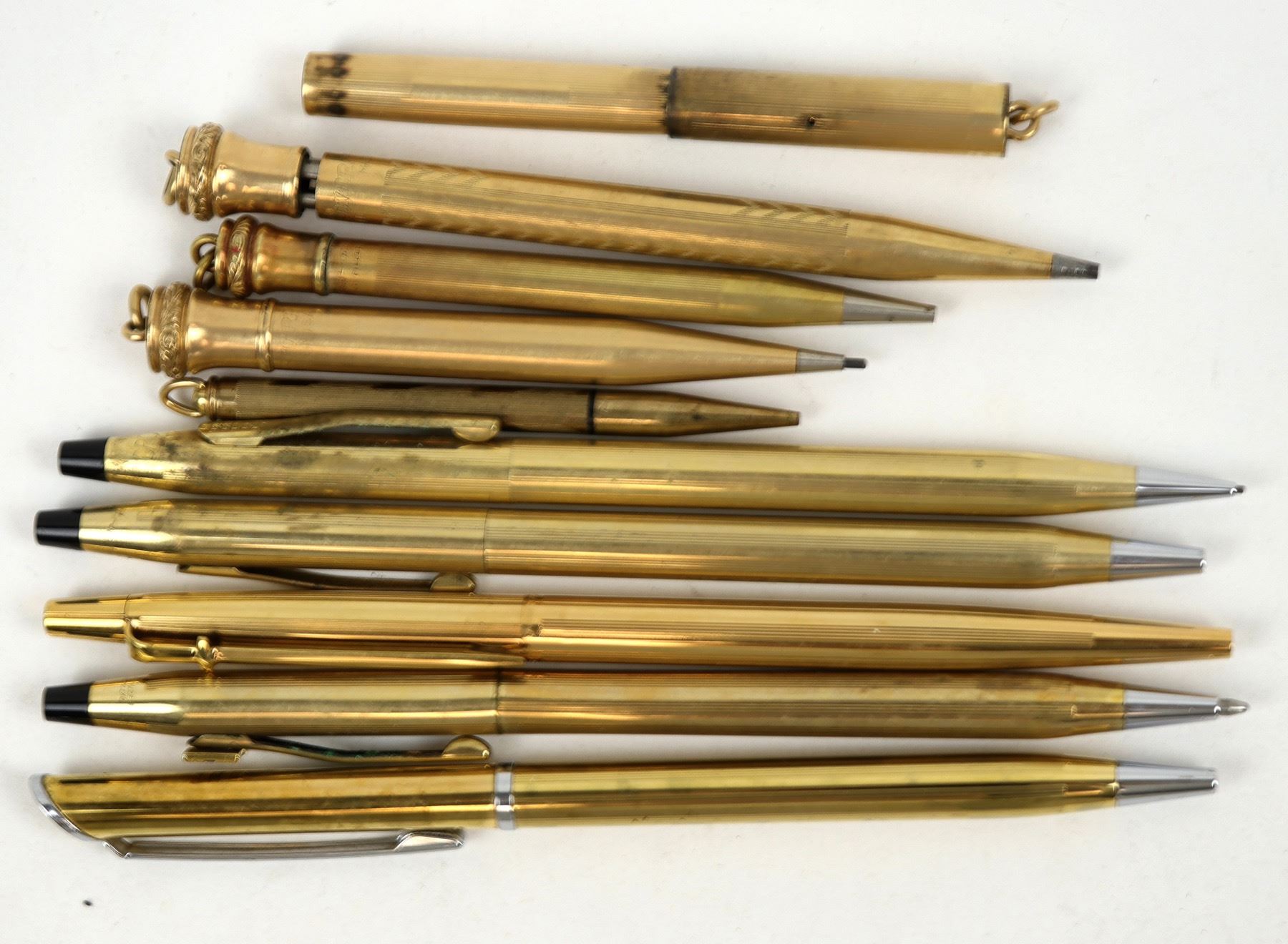 Gold-plated pen/pencil sets, five in typical length and five shorter, probably designed to be hung from a pendant or lanyard. See photo for style details. City: State: Date: Salvatore Falcone Collection